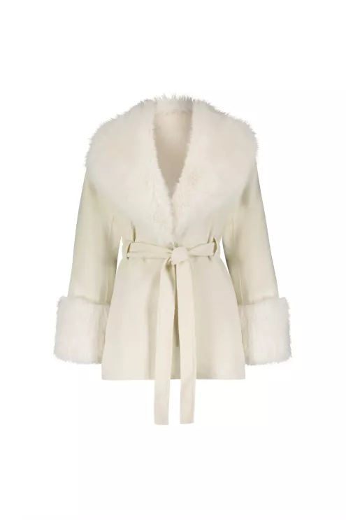 A chic mid-length layer for the bride who prioritizes comfort with style; its soft fur trim offers a cozy yet polished look for outdoor ceremonies or winter portraits.