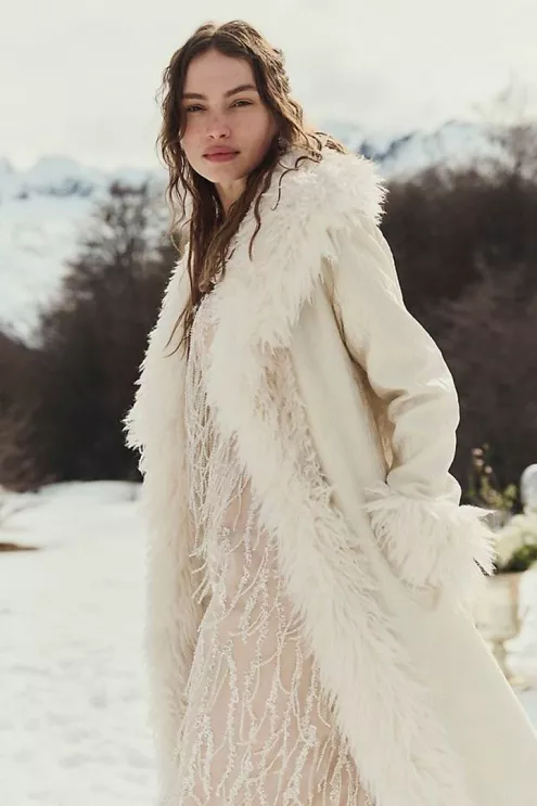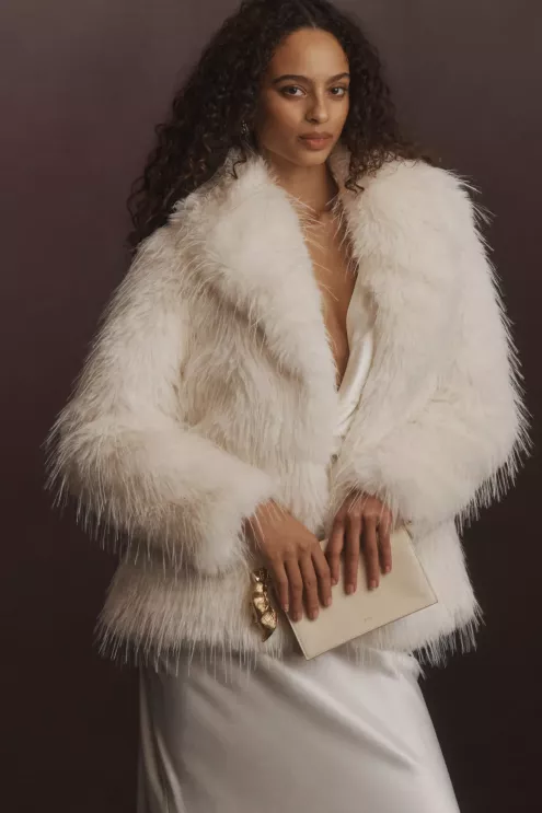 Whether a bride is exchanging vows in the mountains, celebrating at a city rooftop or slipping outside for frosty golden-hour portraits, these pieces offer warmth without sacrificing elegance. Think plush faux fur, sculptural silhouettes and soft ivory tones that complement everything from sleek satin to fully embellished minis.
