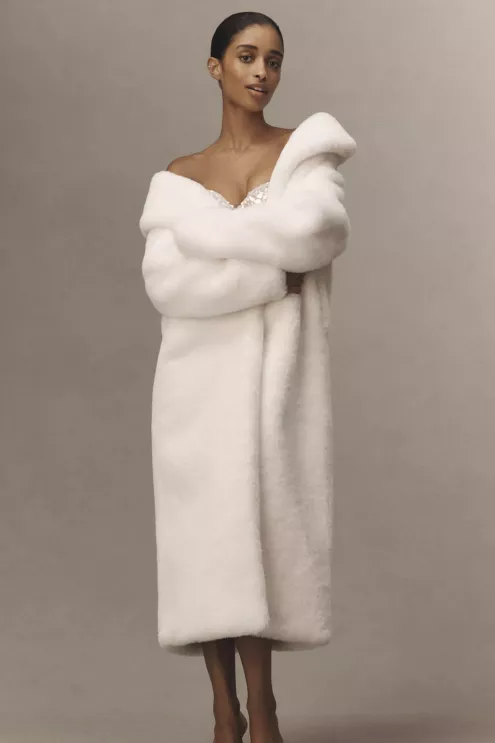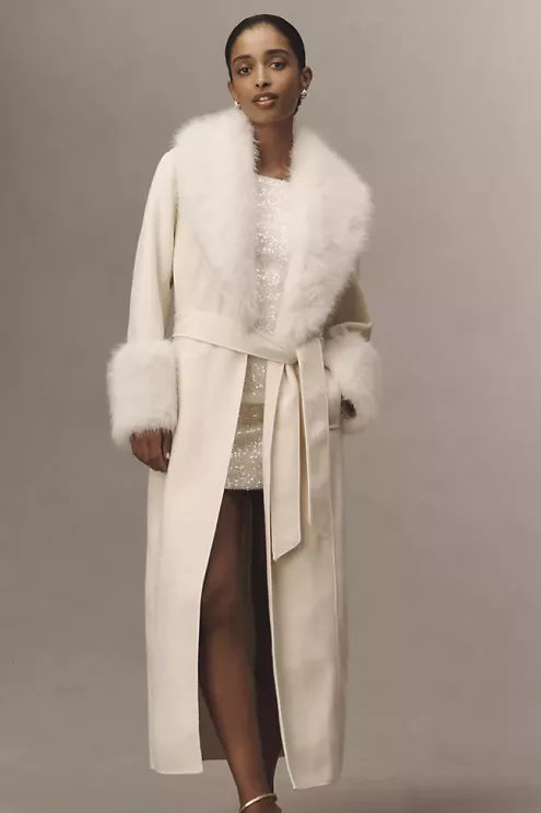 Perfect for the bride who wants timeless glamour with a hint of old-Hollywood softness, this structured coat with its oversized fur collar and cuffs suits anyone leaning into polished, sophisticated ceremony style.