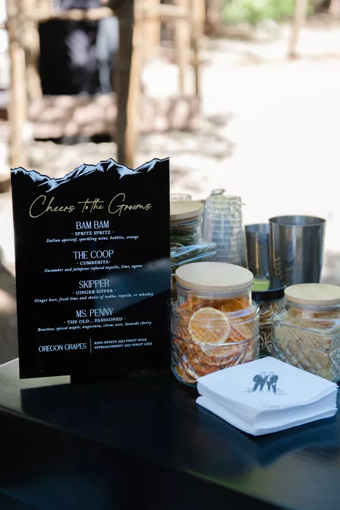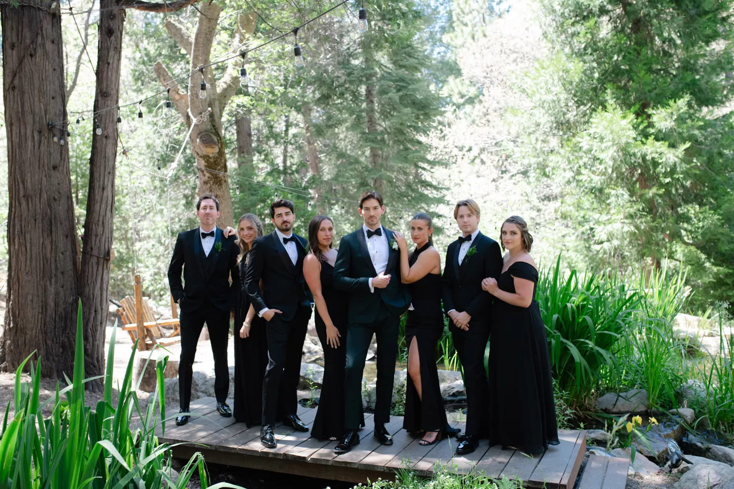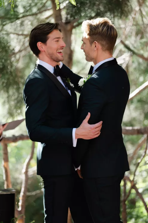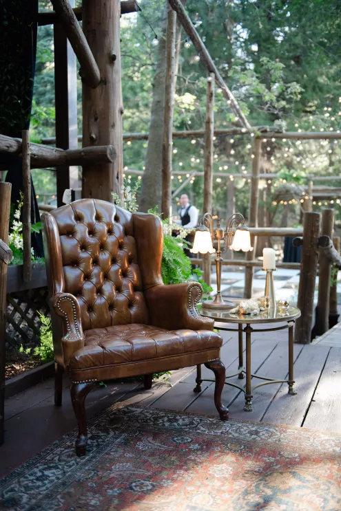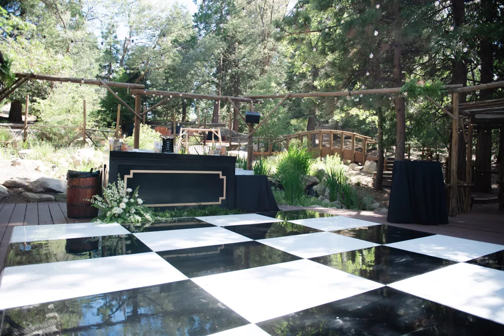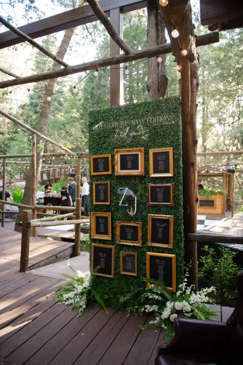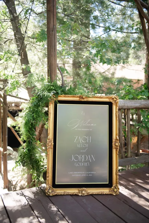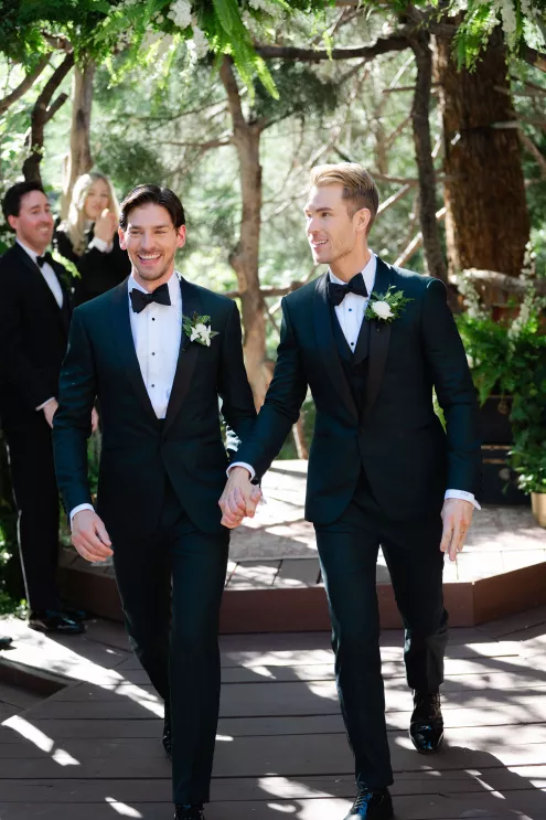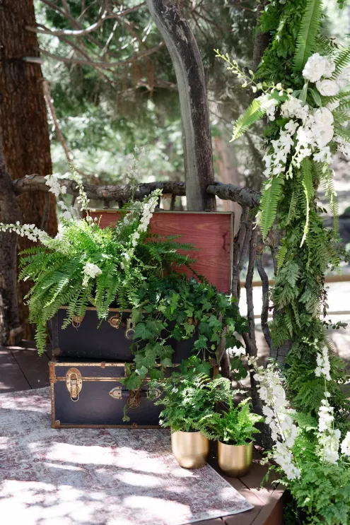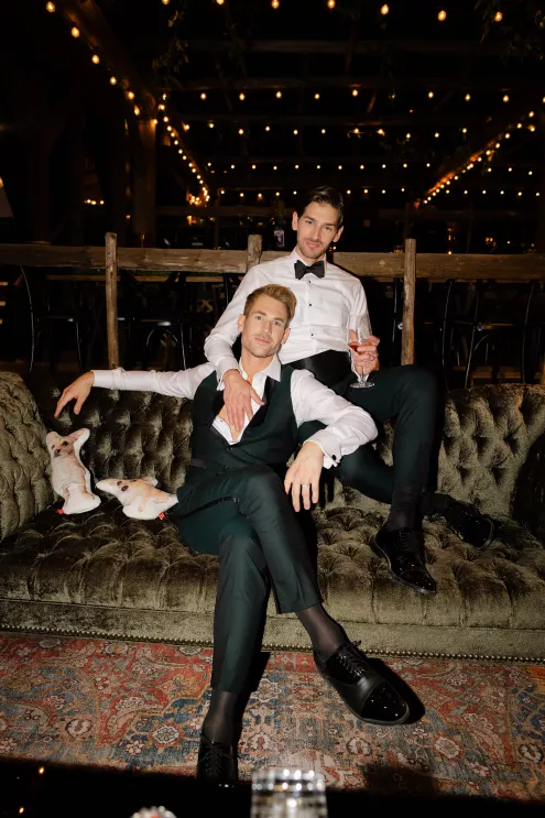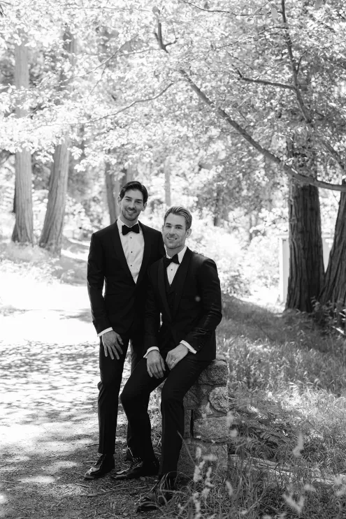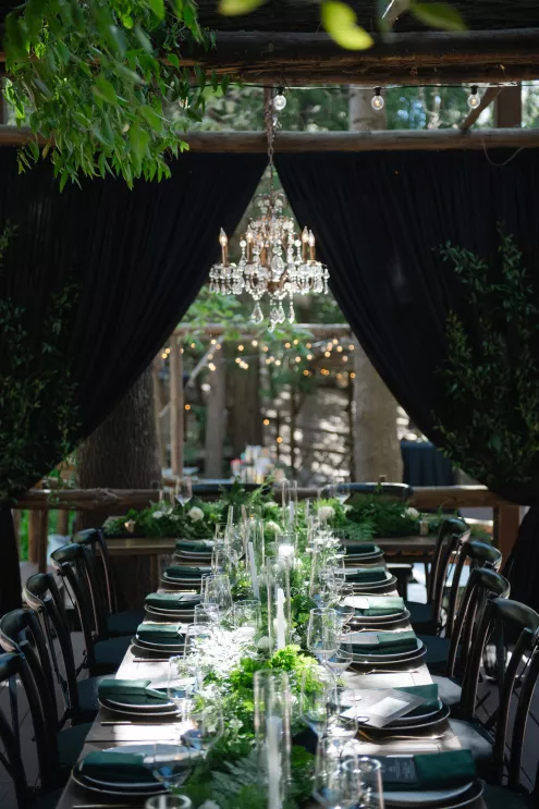 In this age of technology, Zachary Kelch and Jordan Godfrey met in what is now a rather rare fashion: at a bar. Shortly after Jordan spotted Zach and boldly introduced himself, they knew they had a special connection. When Jordan proposed to Zach on his birthday, at sunset, while they were on vacation in Mexico, Zach “gave the easiest, ugly-teared response of his life.” After a long engagement, the happy couple’s wedding day was a much-awaited affair of Old Hollywood elegance standing out against the rustic backdrop of Lake Arrowhead at Pine Rose Cabins. The classically handsome pair, looking refined in their deep green tuxedos, exchanged their vows in dappled sunlight under a canopy of trees and framed by their loving wedding party, all dressed in black. Lush greenery overflowed from every aspect of Zach and Jordan’s special day; the enchanted forest design made complete with the use of vintage furniture and rich textures set against black and gold accents. Candlelight and crystal chandeliers gave the evening a warm, romantic glow, which was enhanced by the abundant foliage and dramatic drapery that perfectly blended their vision into an eclectic aesthetic uniquely their own. As the sky deepened into night, the party moved to the outdoor black-and-white checkered dance floor, where Jordan and Zach celebrated their union under the stars.