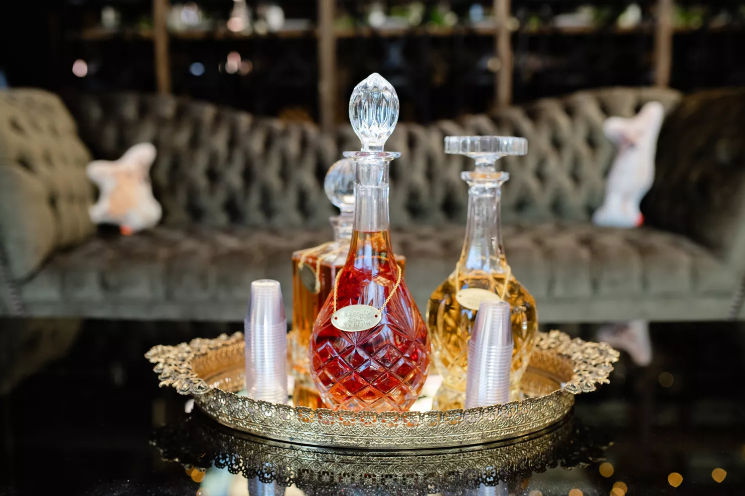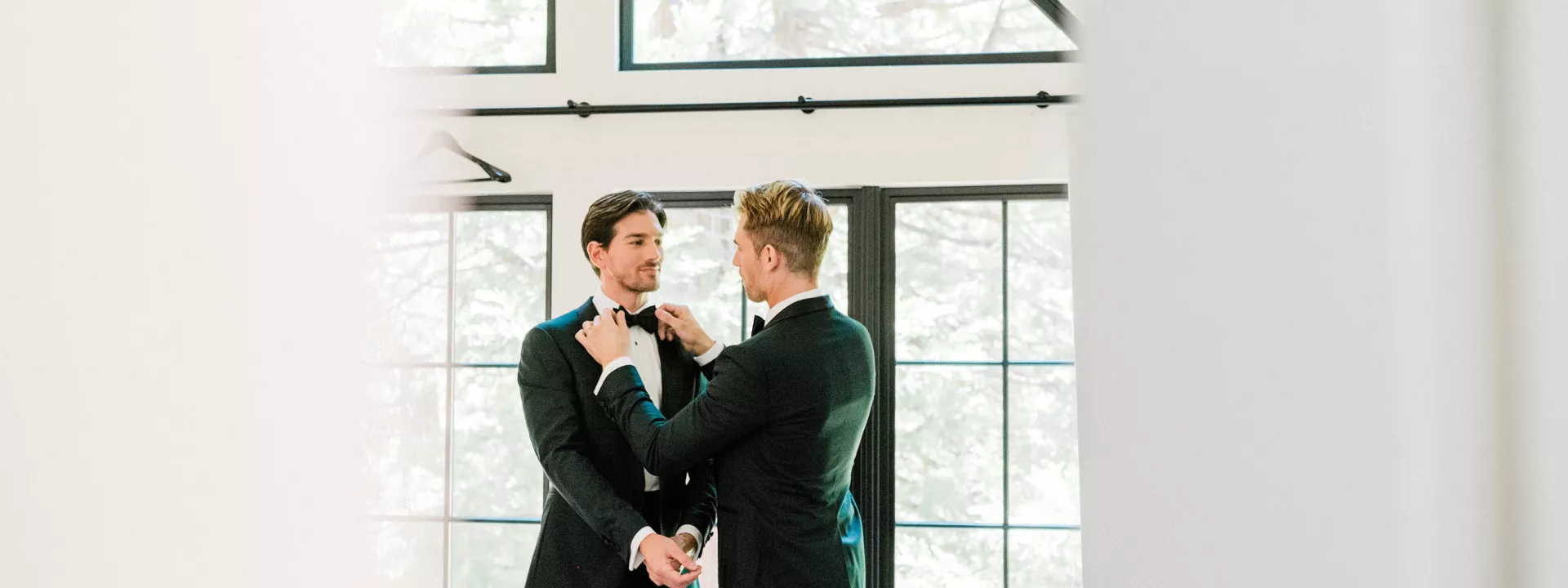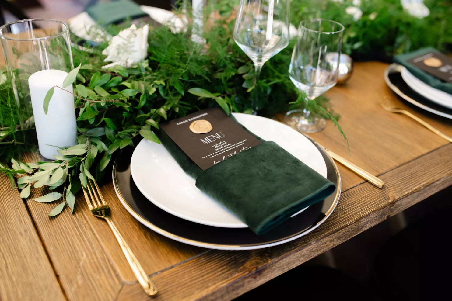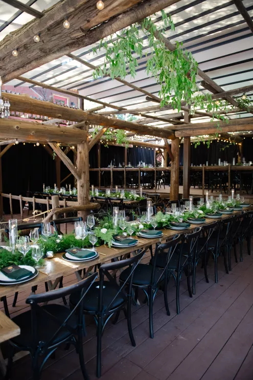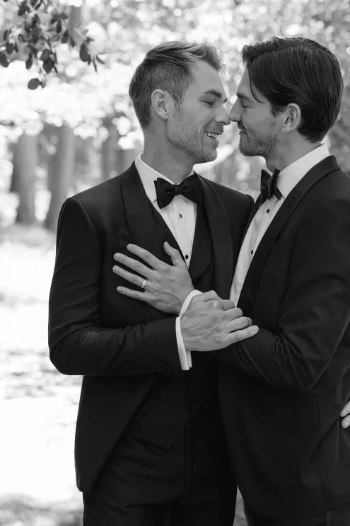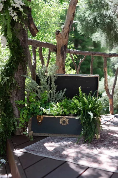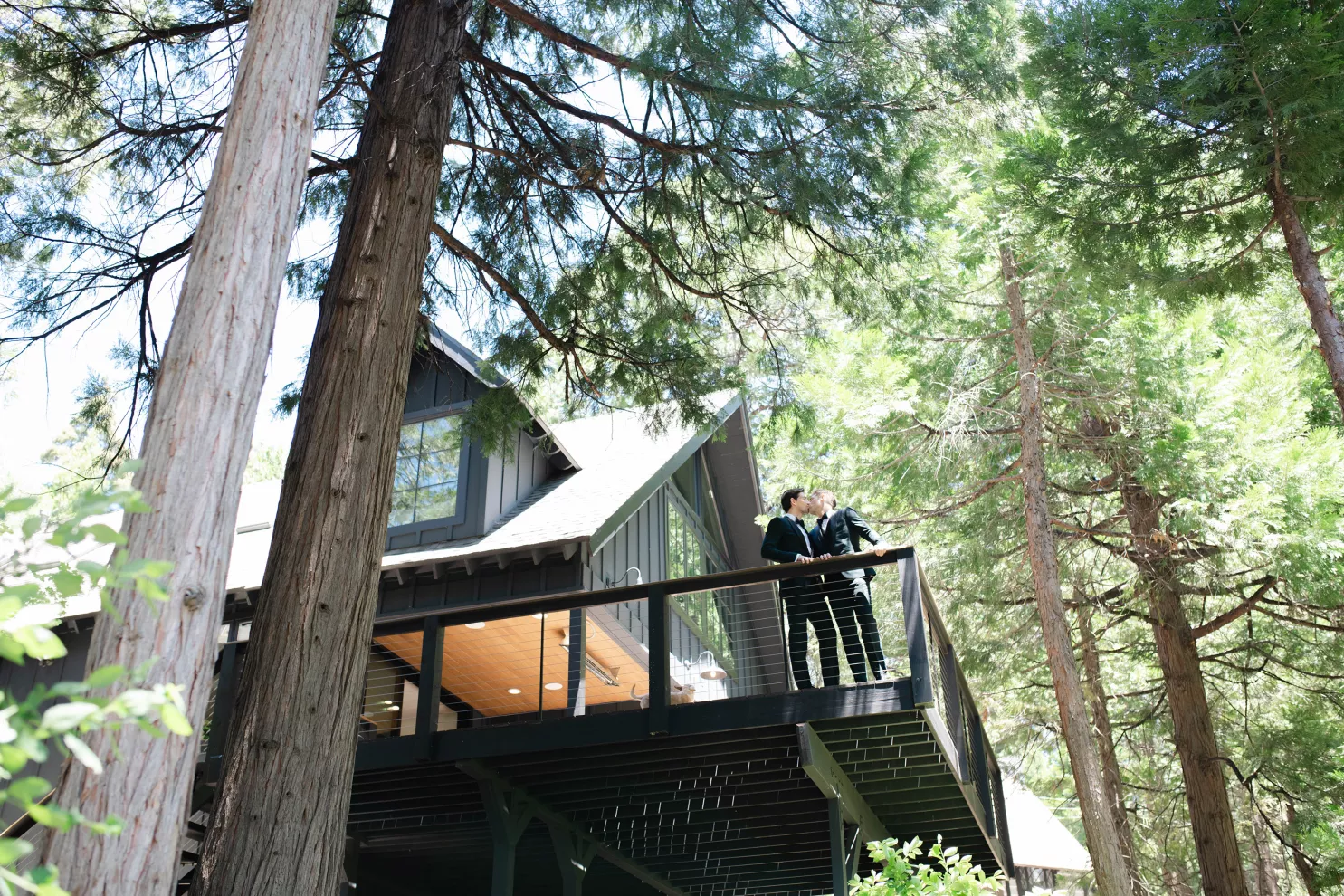 In this age of technology, Zachary Kelch and Jordan Godfrey met in what is now a rather rare fashion: at a bar. Shortly after Jordan spotted Zach and boldly introduced himself, they knew they had a special connection. When Jordan proposed to Zach on his birthday, at sunset, while they were on vacation in Mexico, Zach “gave the easiest, ugly-teared response of his life.” After a long engagement, the happy couple’s wedding day was a much-awaited affair of Old Hollywood elegance standing out against the rustic backdrop of Lake Arrowhead at Pine Rose Cabins. The classically handsome pair, looking refined in their deep green tuxedos, exchanged their vows in dappled sunlight under a canopy of trees and framed by their loving wedding party, all dressed in black. Lush greenery overflowed from every aspect of Zach and Jordan’s special day; the enchanted forest design made complete with the use of vintage furniture and rich textures set against black and gold accents. Candlelight and crystal chandeliers gave the evening a warm, romantic glow, which was enhanced by the abundant foliage and dramatic drapery that perfectly blended their vision into an eclectic aesthetic uniquely their own. As the sky deepened into night, the party moved to the outdoor black-and-white checkered dance floor, where Jordan and Zach celebrated their union under the stars.