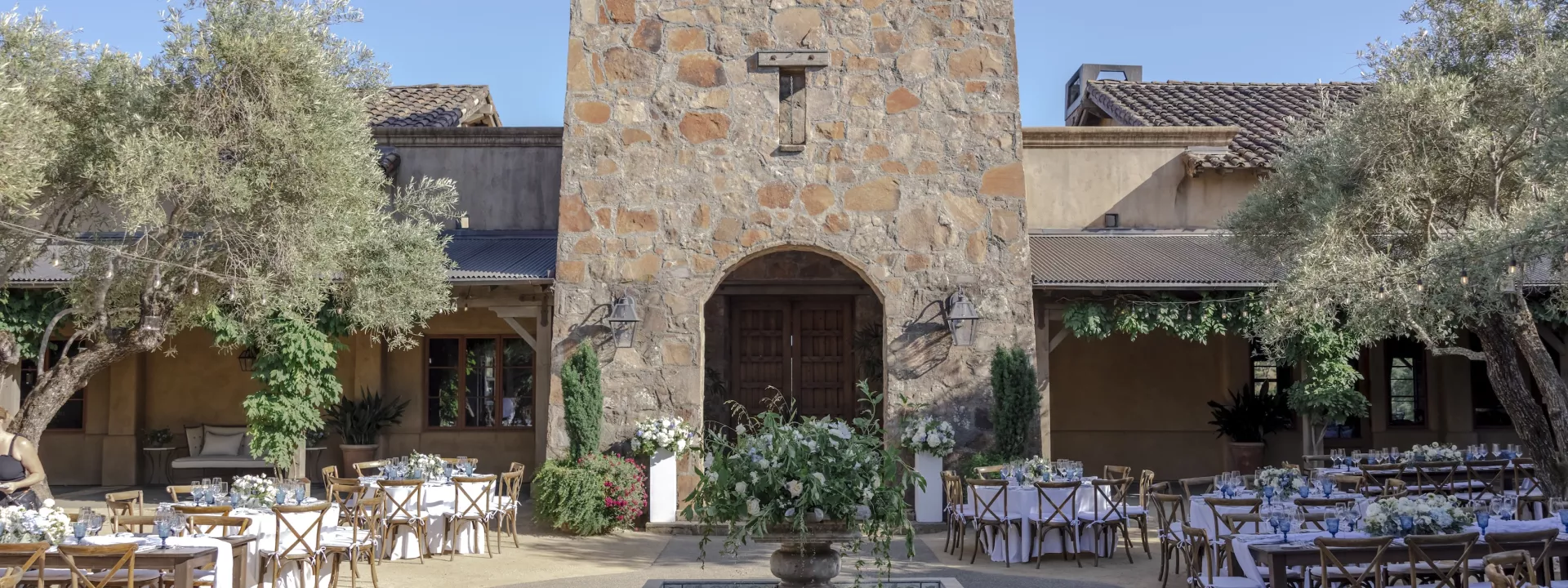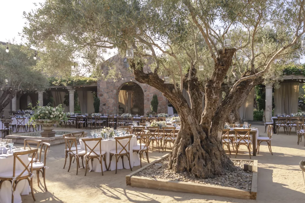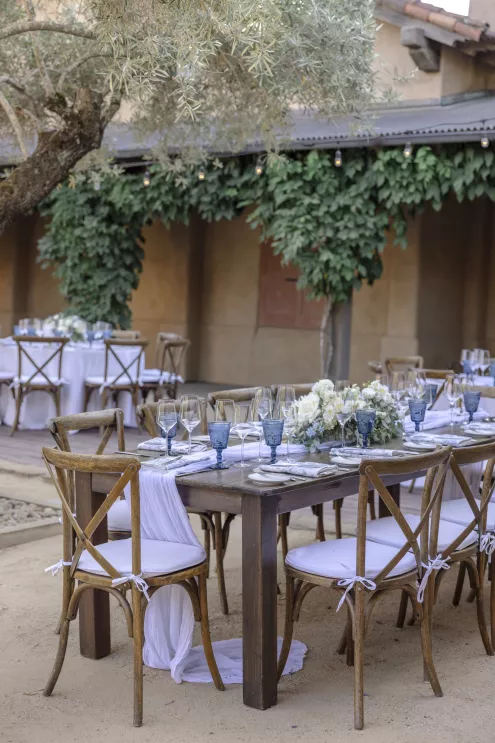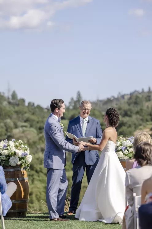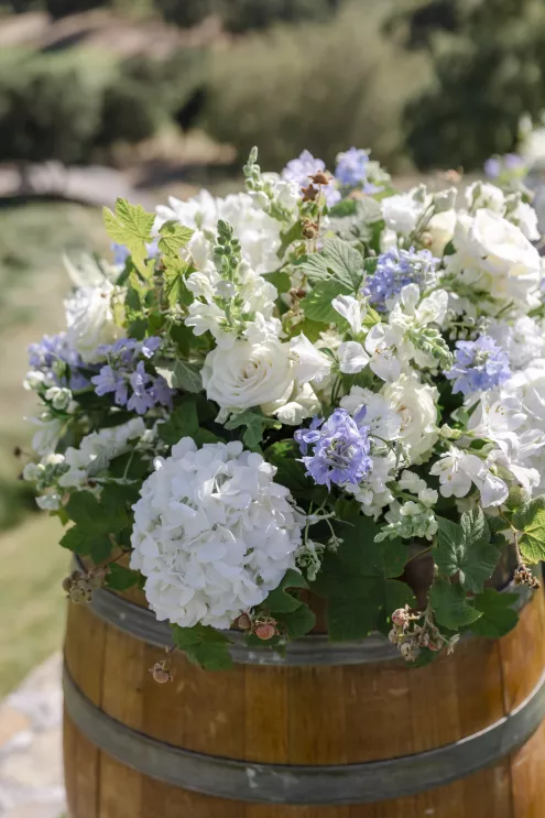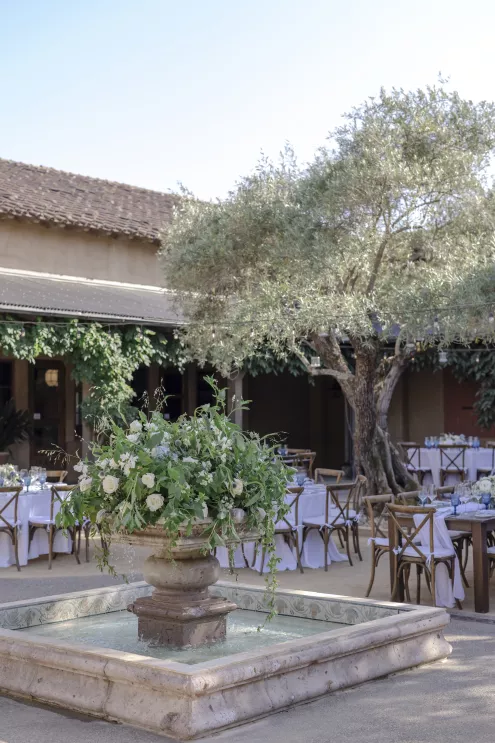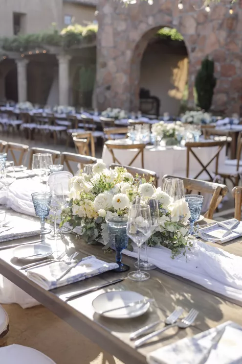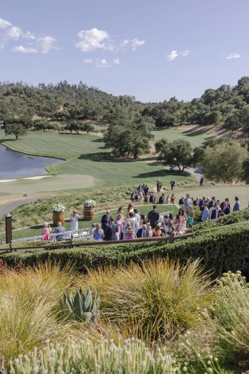 Setting the tone for a deeply family-focused wedding, a barbecue, wine-tasting and welcome party held prior to the wedding established a warm comfort level. The groom’s uncle officiated the marriage ceremony, and godparents offered readings for a touching twist to the personalized proceedings, surrounded by the stunning scenery and stone of the Mayacama courtyard.