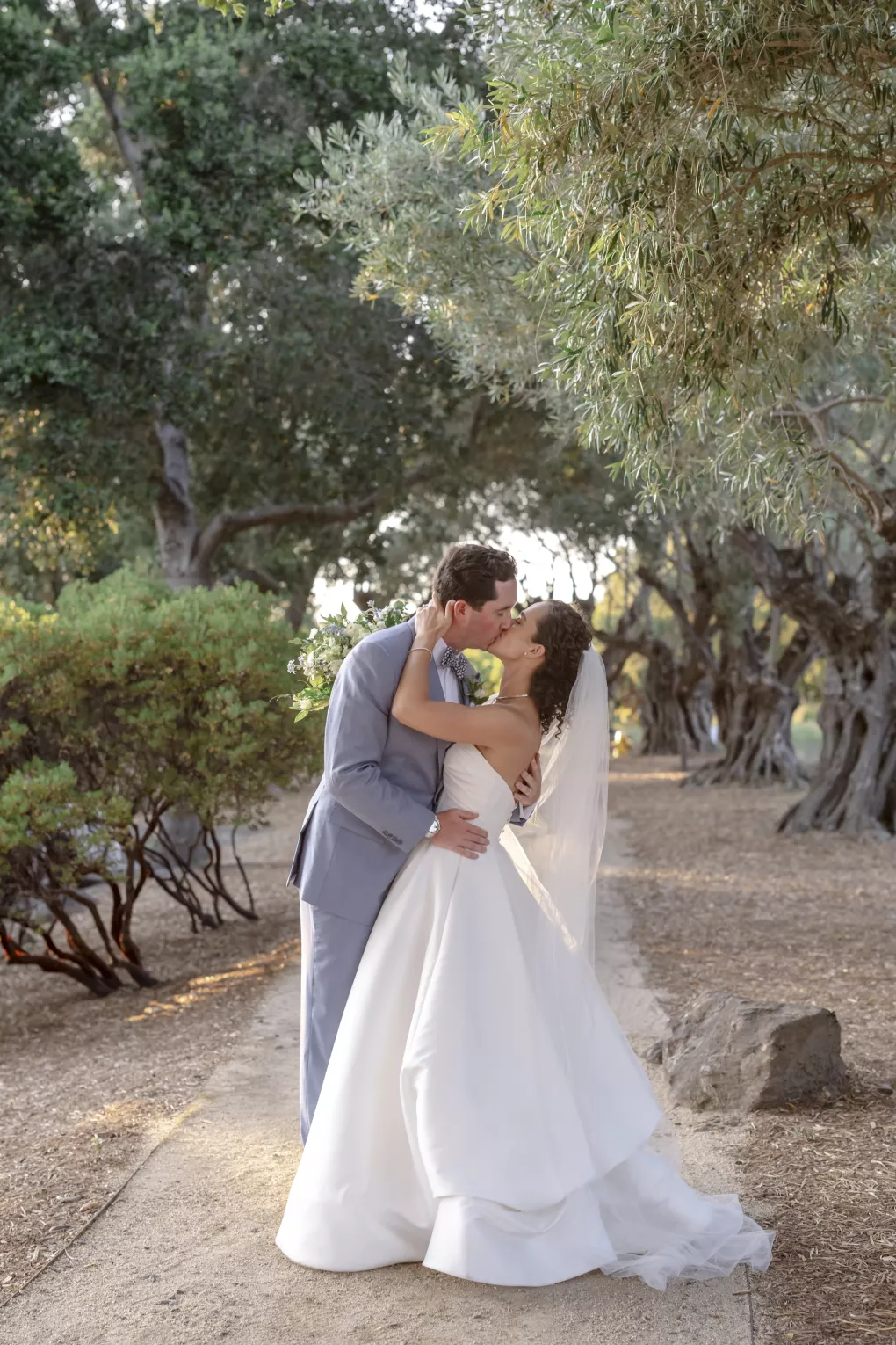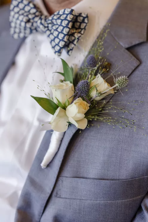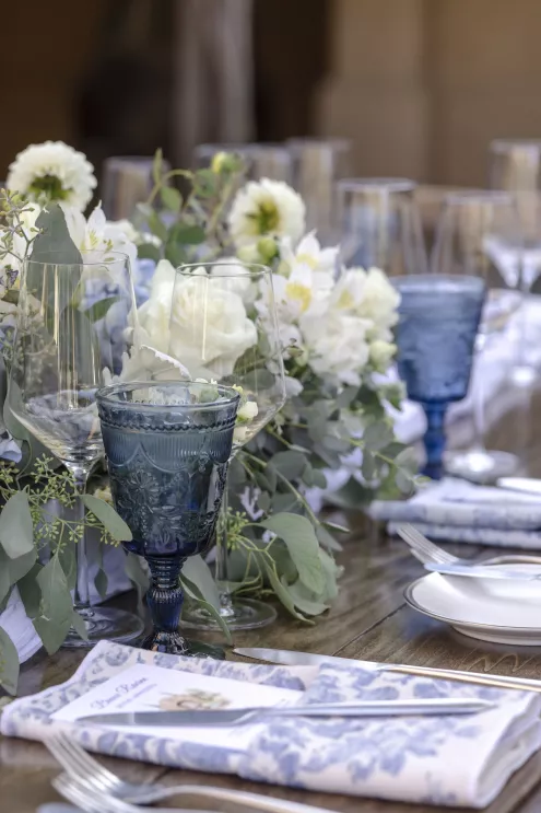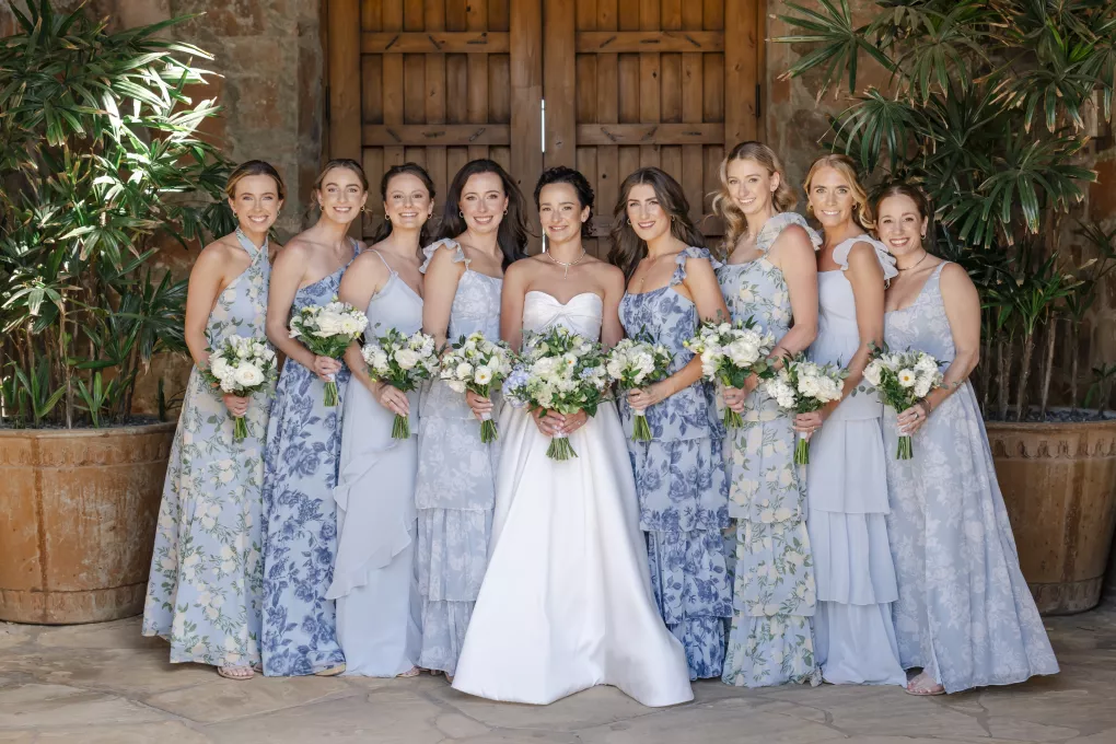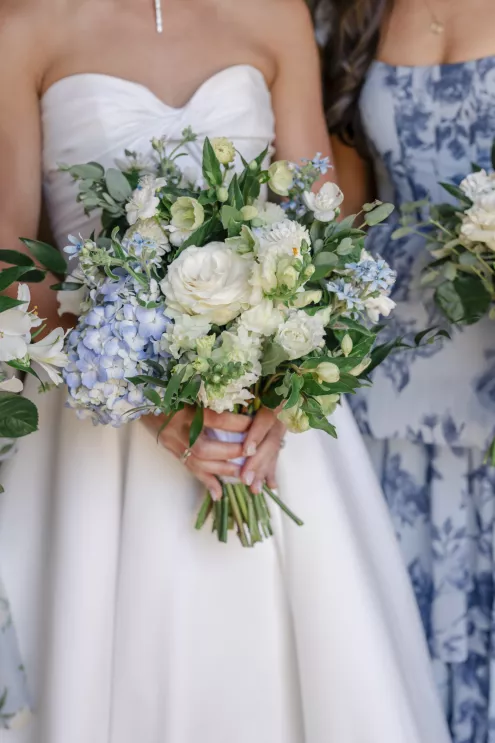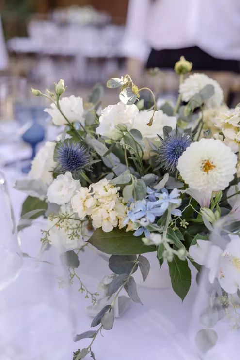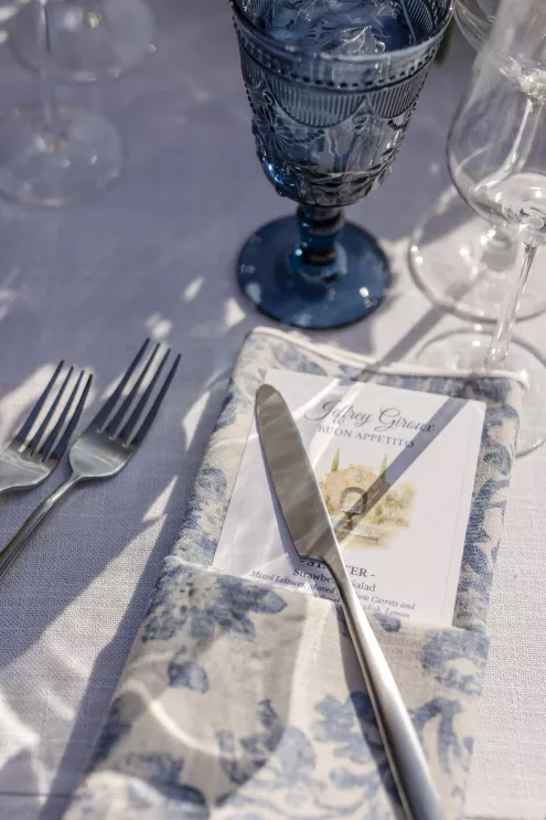 Buoyed by a classic brass band, an Italian-inspired dinner charmed with a delicate color palette enhanced by ivory and sage florals and elevated by touches of lovely lilac blue. Stationery and paper goods designed by Madison added touches of Italian flair to whimsical watercolors, a sweet reference to Tommy’s heritage. With Aperol spritzes in hand, guests were warmed by the bright sun and the couple’s radiant love. Stepping aside for a private cake cutting, the pair savored their naturally refined and elegantly rustic wedding celebration.