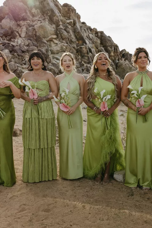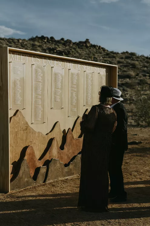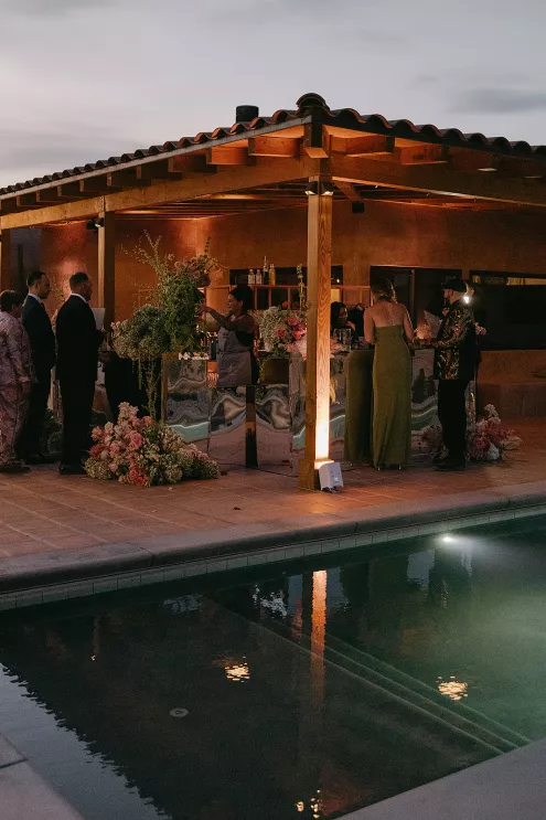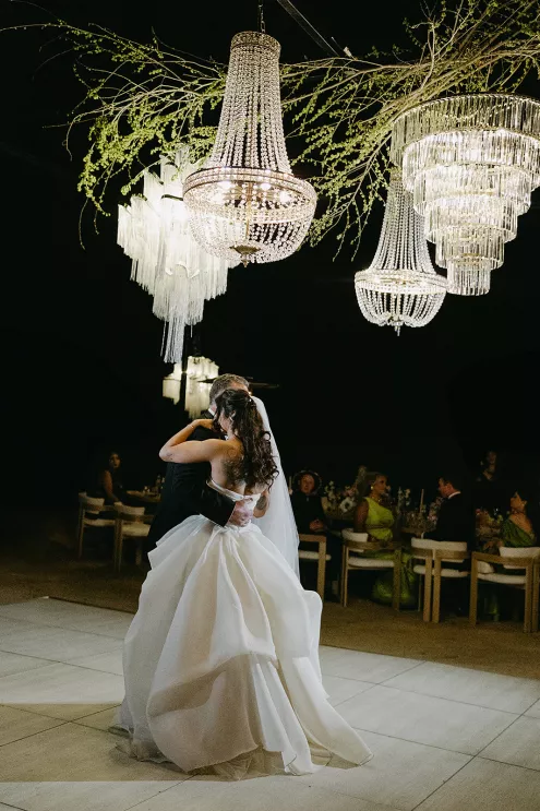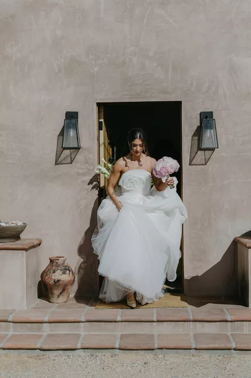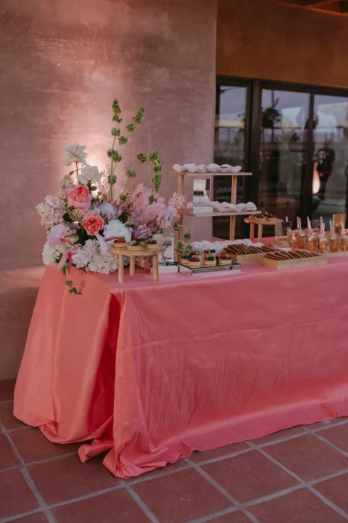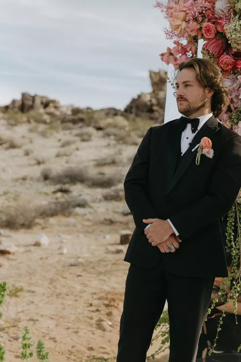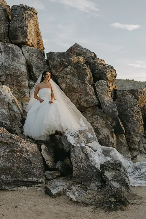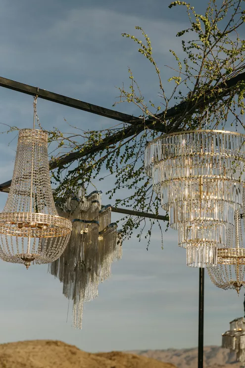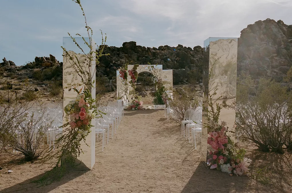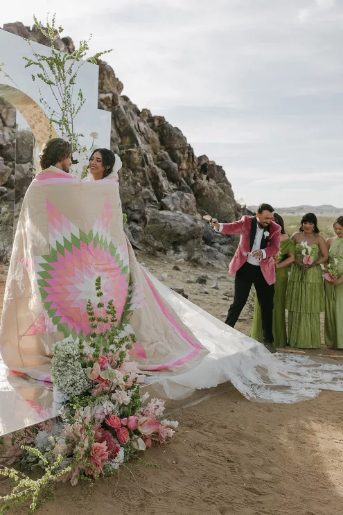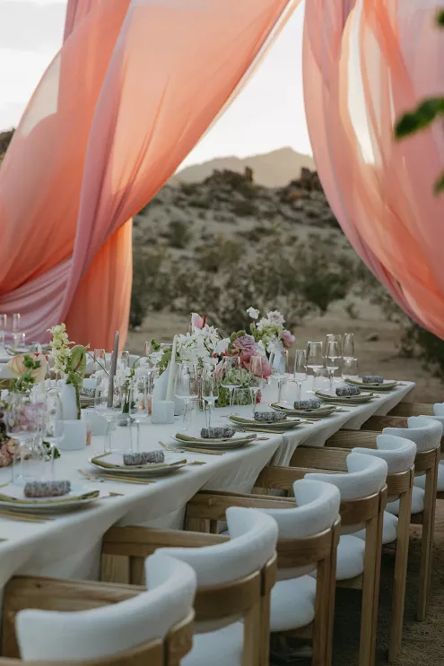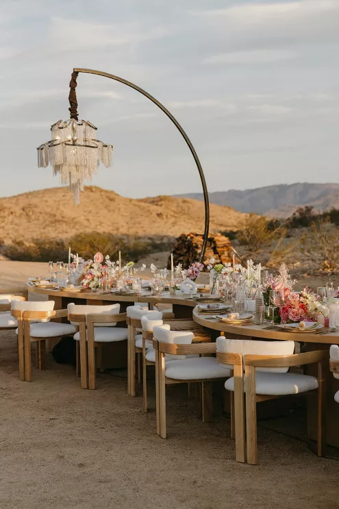 Ciara and Gage have known each other all their lives. Connected through their parents who went to high school together, they shared a few exchanges and some embarrassing attempts at flirting but ultimately lost contact. As they were finishing high school, they reconnected and began a 10-year long-distance relationship before Gage proposed in New York. For their wedding, the pair chose Morada in Joshua Tree to satisfy the bride’s love of the California desert and the groom’s rugged style. Among cacti and boulders, Michelle Garibay Events created a black-tie event. Guests were encouraged to dress the part, as the couple described their dress code as “Desert x MET.” A mirrored asymmetrical arch adorned with flushed pink blooms and fresh winding vines rose up from the arid dirt, marking the altar at the end of a ghost-chair-lined aisle. Ciara, clad in a ballgown with a tiered skirt and floral-inspired bodice, descended the aisle to Gage. To honor the bride’s Native American background, the couple incorporated a Native blessing from Ciara’s cousin, a blanket-wrapping ceremony handmade by Ciara’s mother symbolizing the joining of two lives and a smudging ceremony to purify and cleanse the space. The celebration continued at dinner, where winding tables with angular details and pops of blush and green were set beneath elegant chandeliers. As the sun set on the vast horizon, Ciara and Gage celebrated their future together.