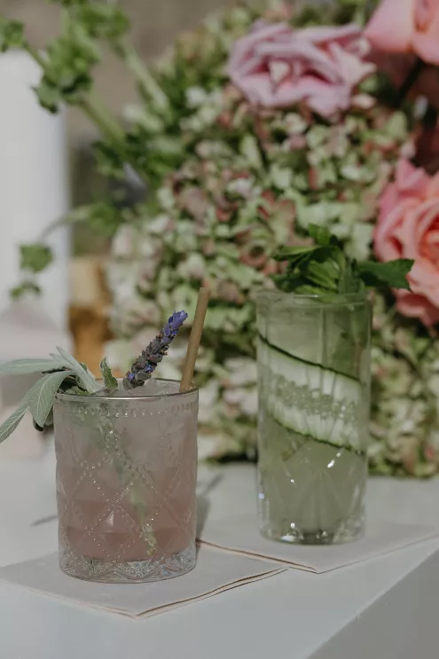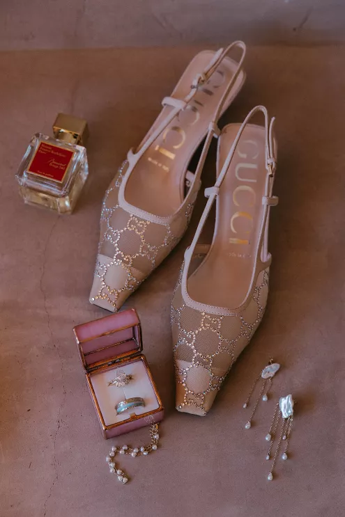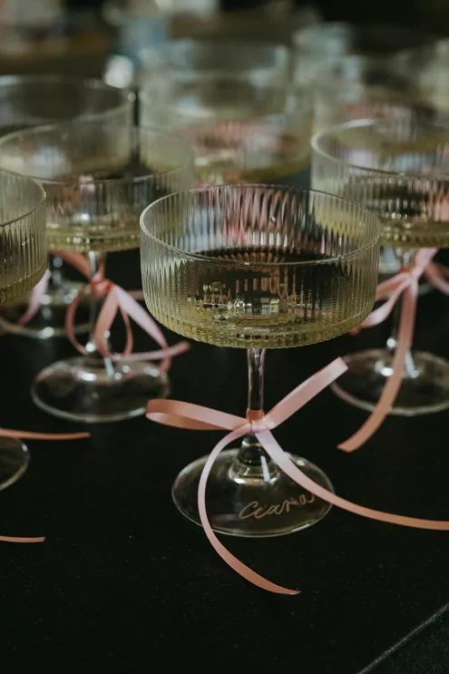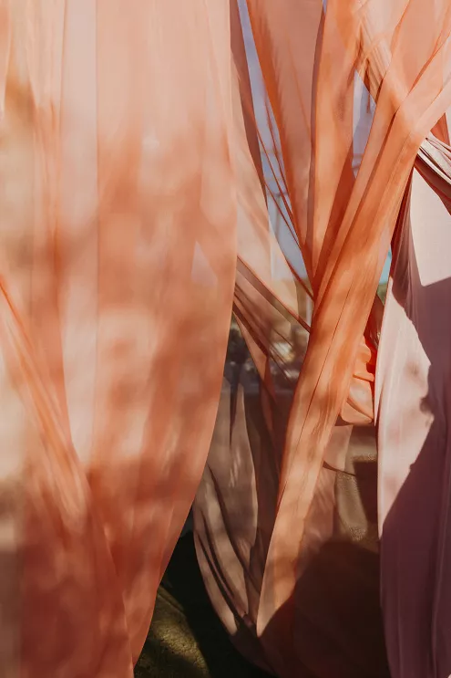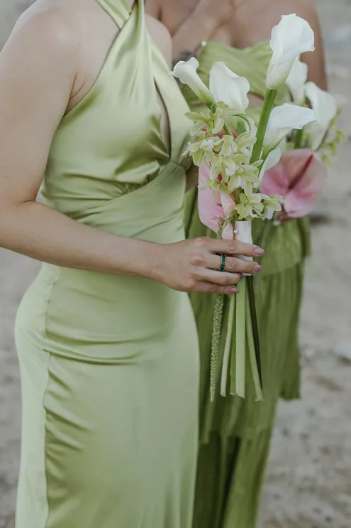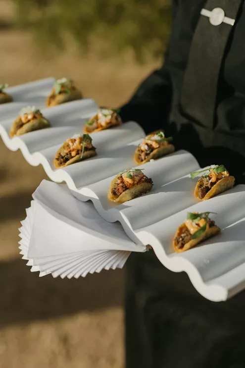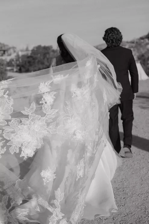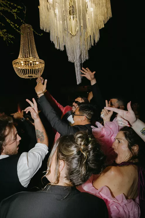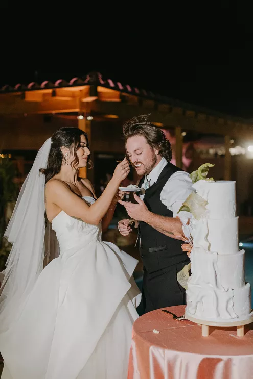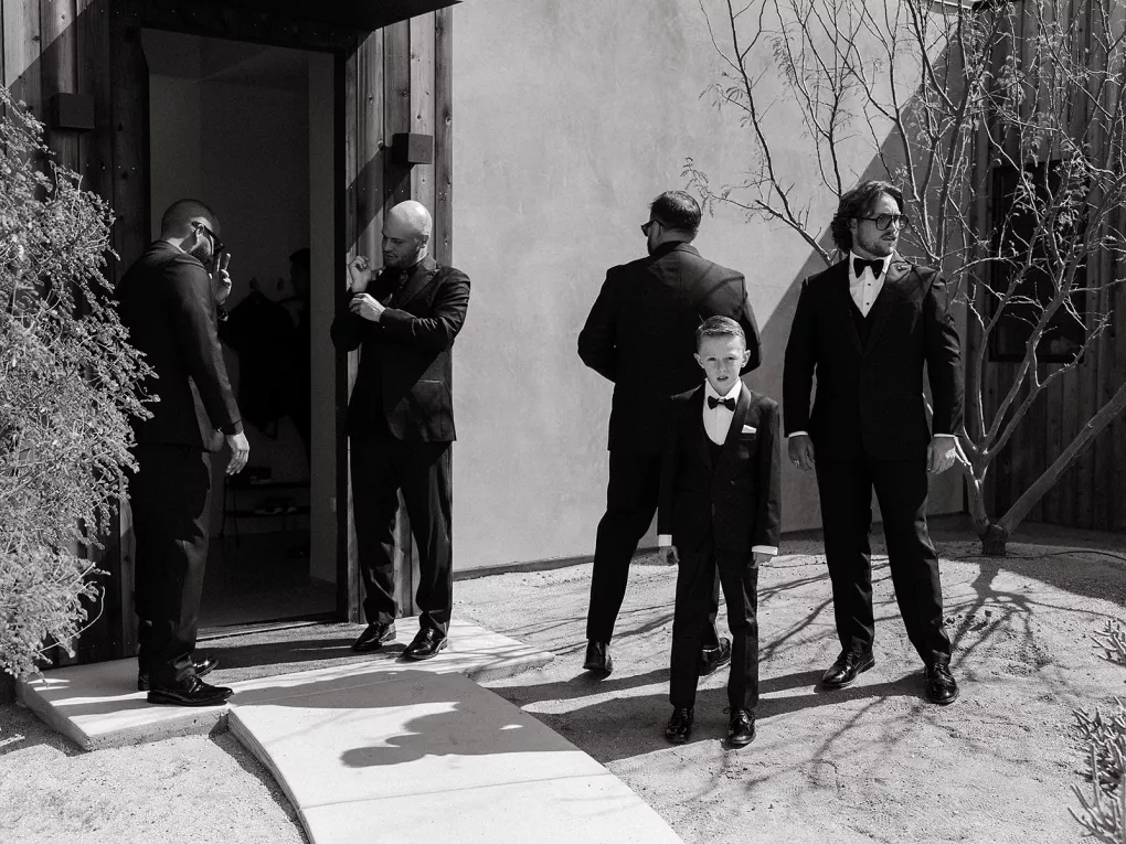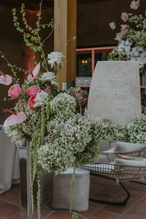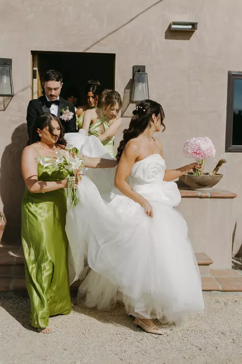 Ciara and Gage have known each other all their lives. Connected through their parents who went to high school together, they shared a few exchanges and some embarrassing attempts at flirting but ultimately lost contact. As they were finishing high school, they reconnected and began a 10-year long-distance relationship before Gage proposed in New York. For their wedding, the pair chose Morada in Joshua Tree to satisfy the bride’s love of the California desert and the groom’s rugged style. Among cacti and boulders, Michelle Garibay Events created a black-tie event. Guests were encouraged to dress the part, as the couple described their dress code as “Desert x MET.” A mirrored asymmetrical arch adorned with flushed pink blooms and fresh winding vines rose up from the arid dirt, marking the altar at the end of a ghost-chair-lined aisle. Ciara, clad in a ballgown with a tiered skirt and floral-inspired bodice, descended the aisle to Gage. To honor the bride’s Native American background, the couple incorporated a Native blessing from Ciara’s cousin, a blanket-wrapping ceremony handmade by Ciara’s mother symbolizing the joining of two lives and a smudging ceremony to purify and cleanse the space. The celebration continued at dinner, where winding tables with angular details and pops of blush and green were set beneath elegant chandeliers. As the sun set on the vast horizon, Ciara and Gage celebrated their future together.