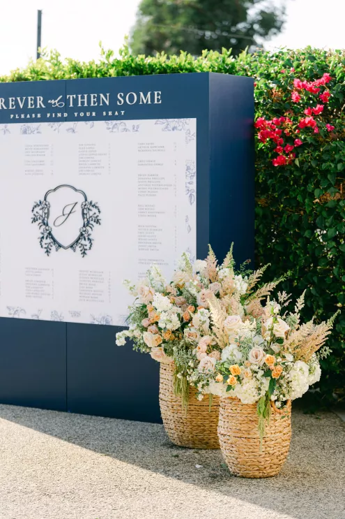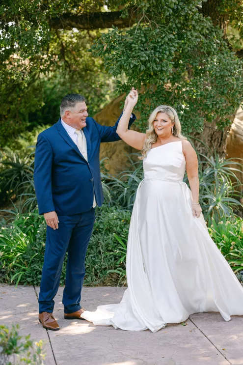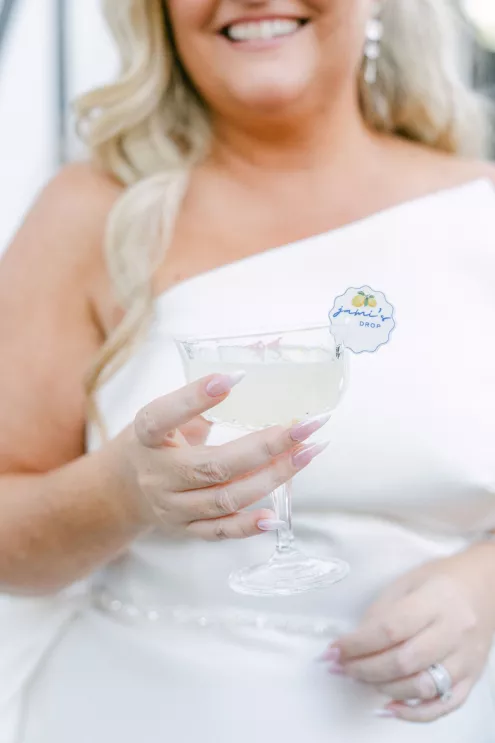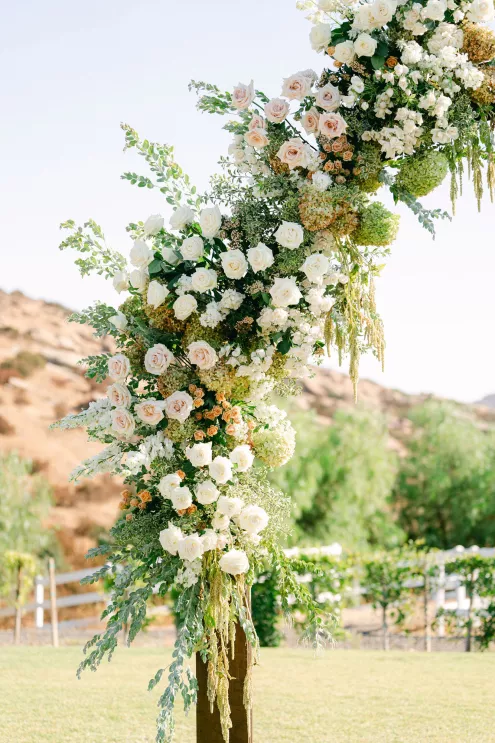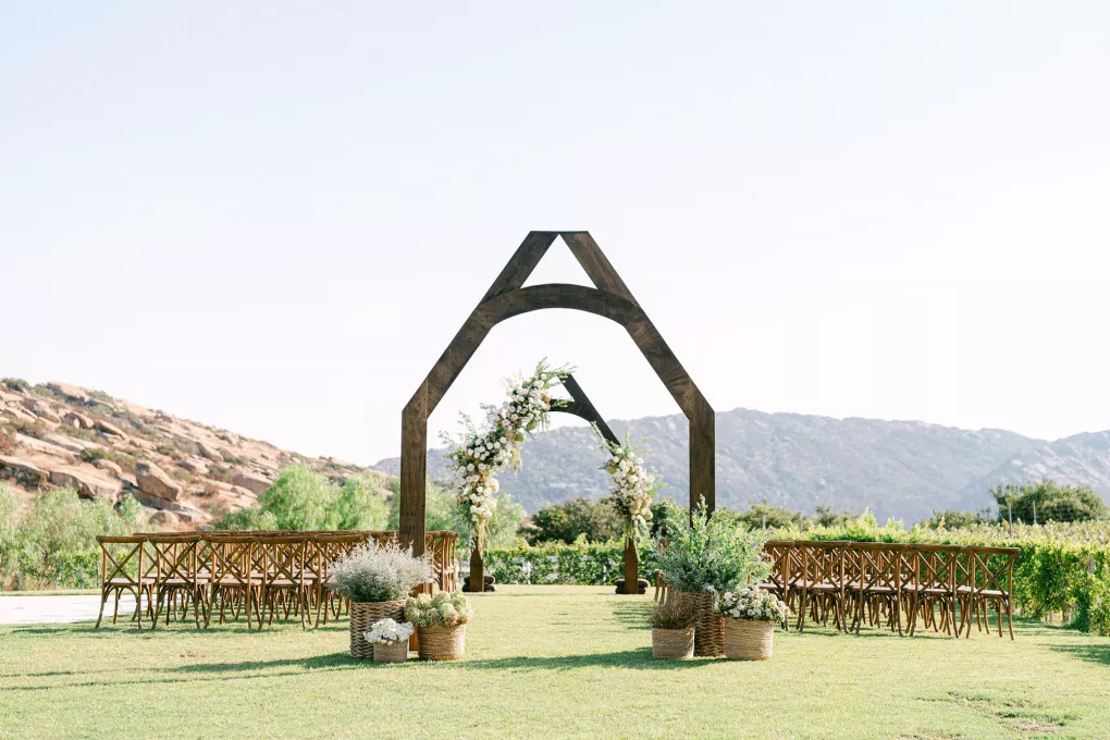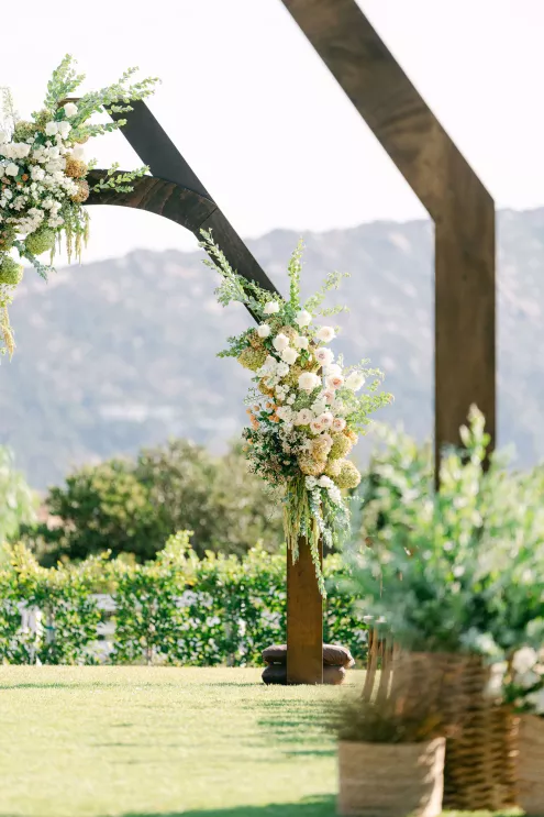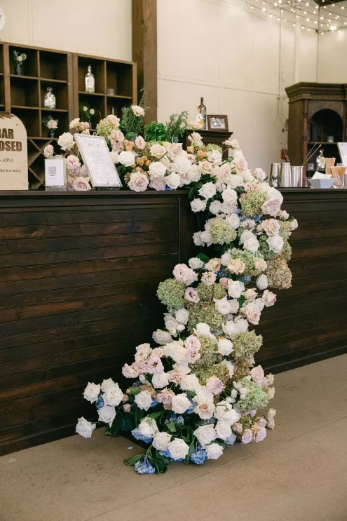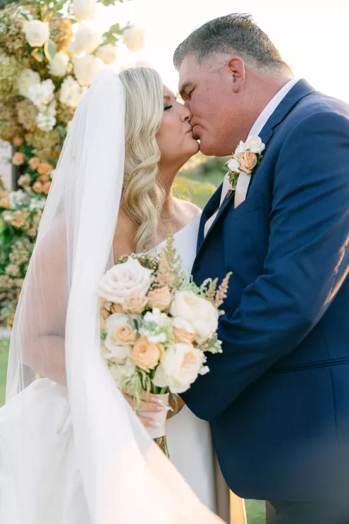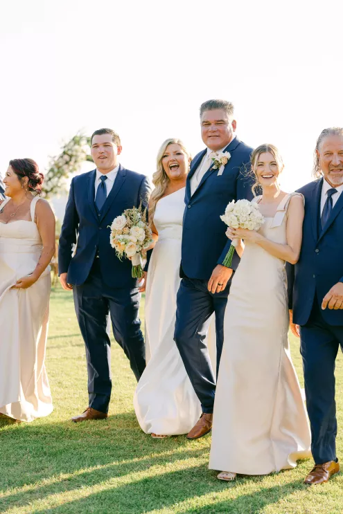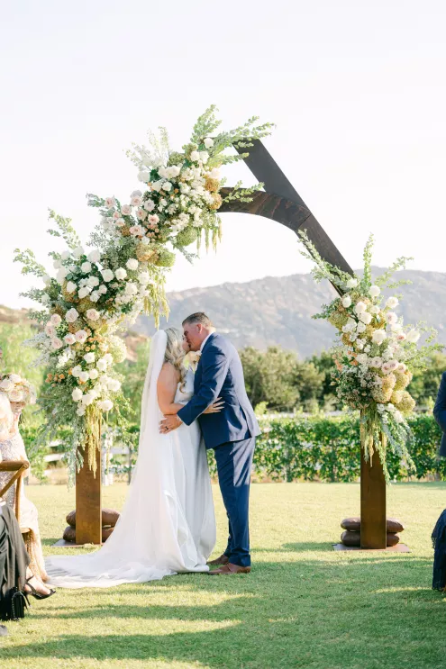 Wedding planners take on the project of a lifetime when they design their own nuptials. Jamison Evans struck a harmonious balance between her professional background and her personal tastes to bring her wedding to Jerry Lopez to life. With 22 years of event planning experience, the bride knew just how to infuse ethereal elegance into the celebration. Two grand arches, bedecked in asymmetrical arrangements of cascading greenery and light-hued blooms, were set up to welcome guests to the open-air ceremony and make the space feel like a regal church, giving the sprawling vineyard a more intimate feel. Jamison’s father did double duty, both leading her down the aisle and officiating the exchange of vows—Jerry’s oldest son humorously asked, “Who is giving her away?” as they reached the altar. The bride’s design included a bow theme that was subtly woven into the celebration, appearing as accents in the bridesmaids’ dresses and the stunning three-tier Lambeth cake. The alfresco festivities continued as friends and family found their seats at round reception tables adorned with cream-colored linens, romantic candlelight and low arrangements of pastel florals, all enhancing the airy vision of the day. Revelry was the true theme of the evening, as each table was assigned a designated “party animal,” who was given the task of keeping their tablemates engaged in the evening’s fun (and sipping on “Jami’s Drops” and “JLo’s Old-Fashioneds,” the newlyweds’ signature cocktails). Naturally, competitive group performances broke out: a flash mob rendition of the macarena “the wave,” and even a lively conga line. Attendees were treated to ample sweet treats throughout the event, including a coffee-and-doughnut display, a paletas cart and a tray of homemade chocolate chip cookies gifted by a dear friend.