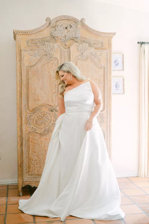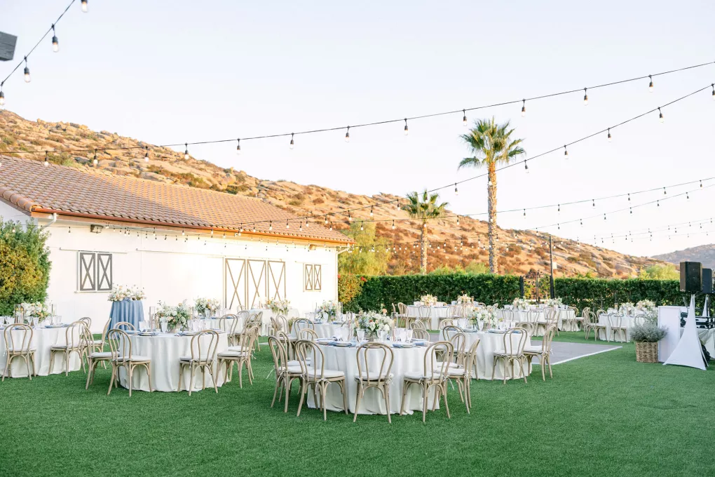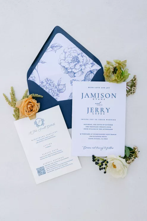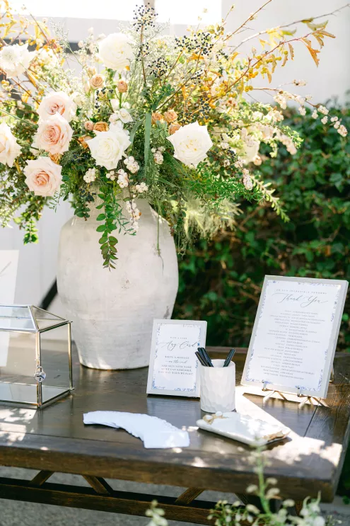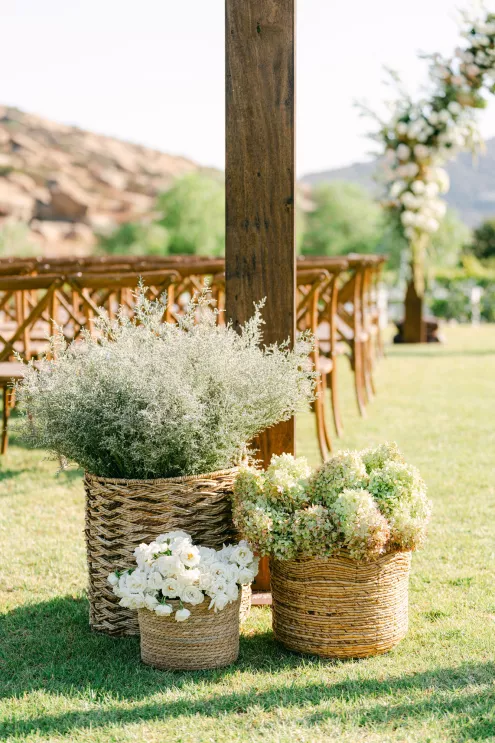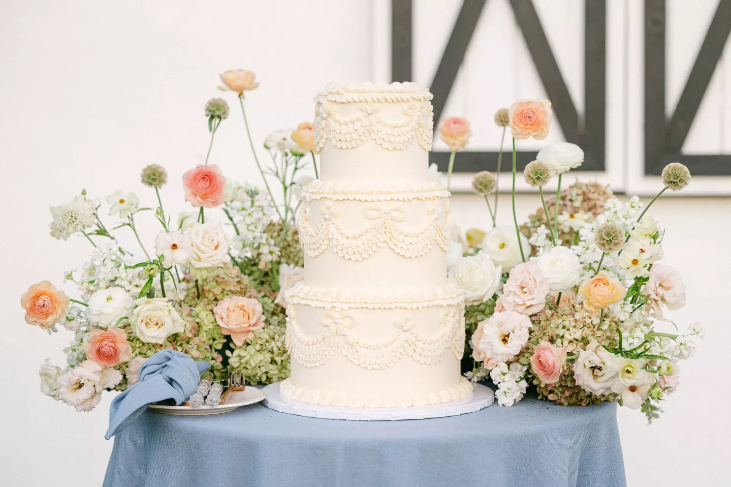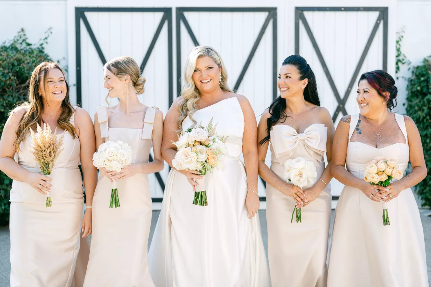 Wedding planners take on the project of a lifetime when they design their own nuptials. Jamison Evans struck a harmonious balance between her professional background and her personal tastes to bring her wedding to Jerry Lopez to life. With 22 years of event planning experience, the bride knew just how to infuse ethereal elegance into the celebration. Two grand arches, bedecked in asymmetrical arrangements of cascading greenery and light-hued blooms, were set up to welcome guests to the open-air ceremony and make the space feel like a regal church, giving the sprawling vineyard a more intimate feel. Jamison’s father did double duty, both leading her down the aisle and officiating the exchange of vows—Jerry’s oldest son humorously asked, “Who is giving her away?” as they reached the altar. The bride’s design included a bow theme that was subtly woven into the celebration, appearing as accents in the bridesmaids’ dresses and the stunning three-tier Lambeth cake. The alfresco festivities continued as friends and family found their seats at round reception tables adorned with cream-colored linens, romantic candlelight and low arrangements of pastel florals, all enhancing the airy vision of the day. Revelry was the true theme of the evening, as each table was assigned a designated “party animal,” who was given the task of keeping their tablemates engaged in the evening’s fun (and sipping on “Jami’s Drops” and “JLo’s Old-Fashioneds,” the newlyweds’ signature cocktails). Naturally, competitive group performances broke out: a flash mob rendition of the macarena “the wave,” and even a lively conga line. Attendees were treated to ample sweet treats throughout the event, including a coffee-and-doughnut display, a paletas cart and a tray of homemade chocolate chip cookies gifted by a dear friend.