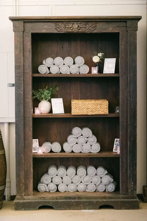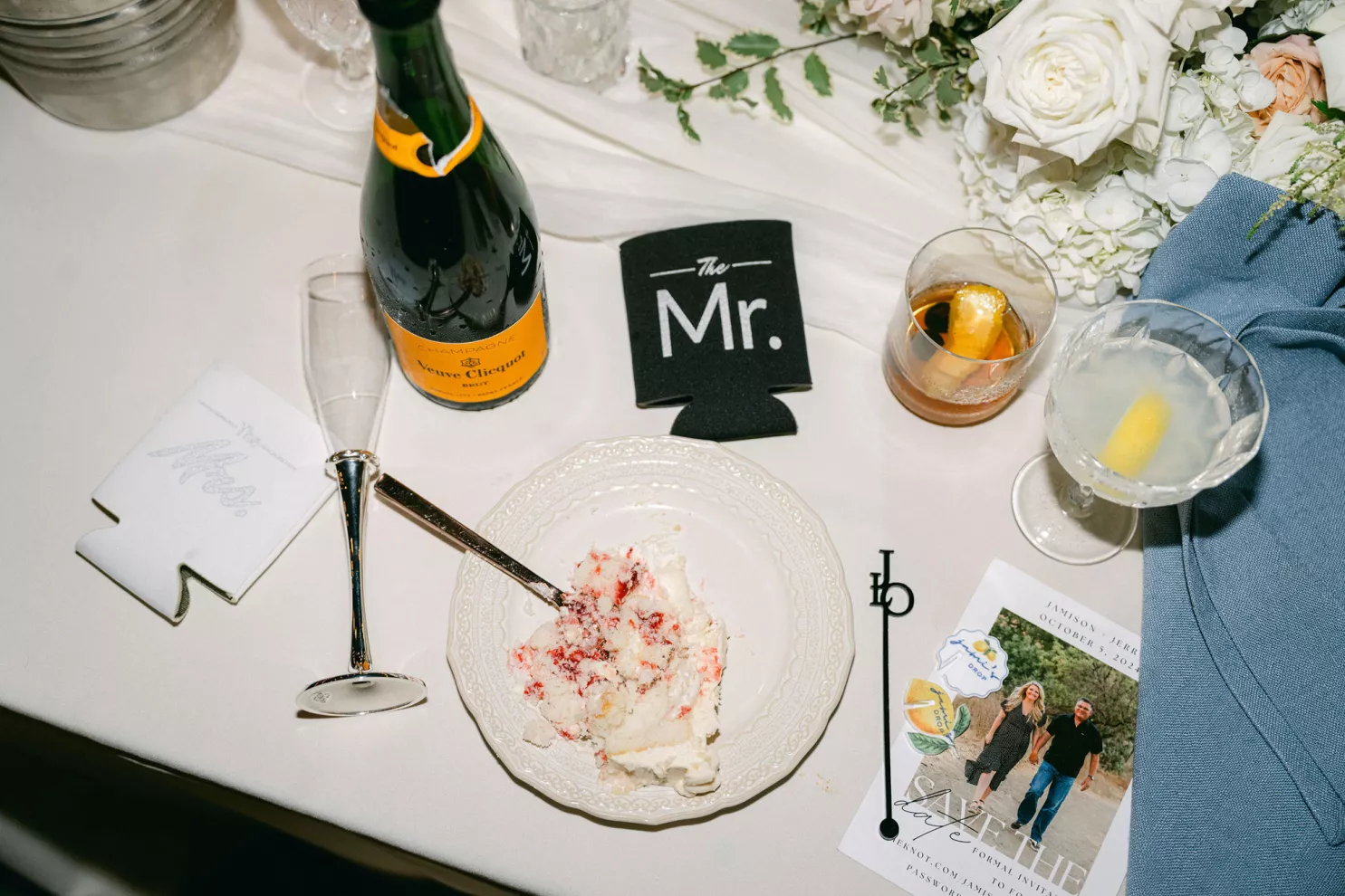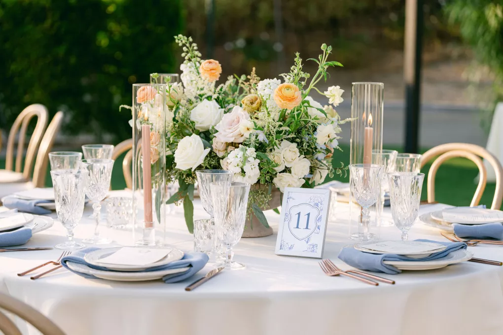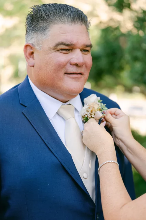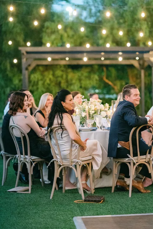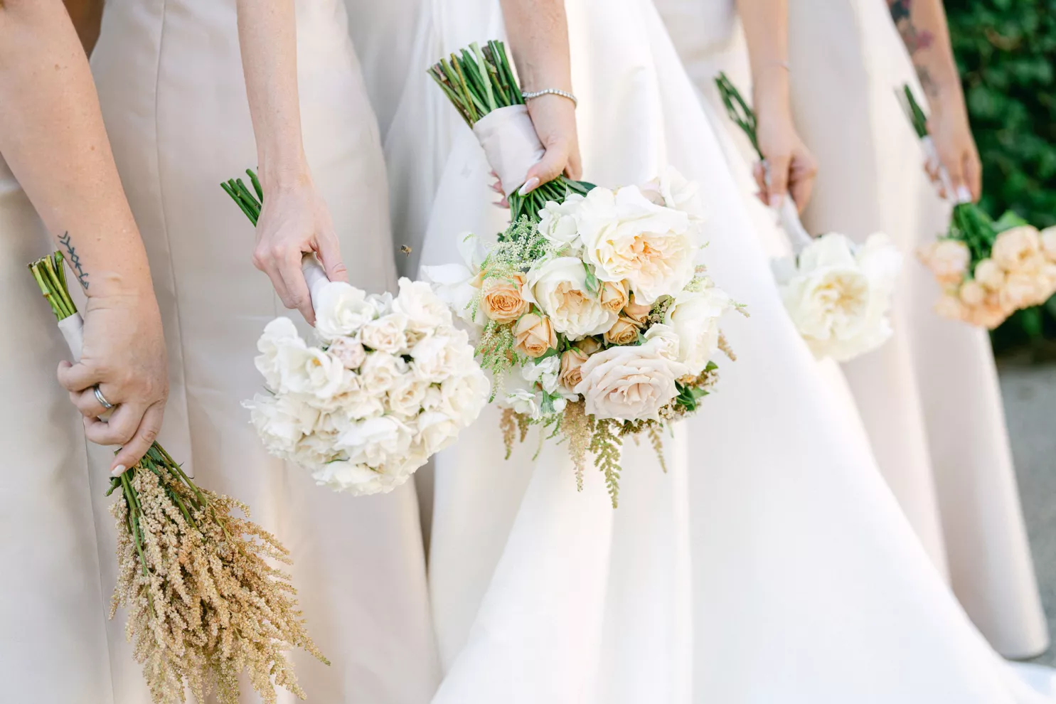 Wedding planners take on the project of a lifetime when they design their own nuptials. Jamison Evans struck a harmonious balance between her professional background and her personal tastes to bring her wedding to Jerry Lopez to life. With 22 years of event planning experience, the bride knew just how to infuse ethereal elegance into the celebration. Two grand arches, bedecked in asymmetrical arrangements of cascading greenery and light-hued blooms, were set up to welcome guests to the open-air ceremony and make the space feel like a regal church, giving the sprawling vineyard a more intimate feel. Jamison’s father did double duty, both leading her down the aisle and officiating the exchange of vows—Jerry’s oldest son humorously asked, “Who is giving her away?” as they reached the altar. The bride’s design included a bow theme that was subtly woven into the celebration, appearing as accents in the bridesmaids’ dresses and the stunning three-tier Lambeth cake. The alfresco festivities continued as friends and family found their seats at round reception tables adorned with cream-colored linens, romantic candlelight and low arrangements of pastel florals, all enhancing the airy vision of the day. Revelry was the true theme of the evening, as each table was assigned a designated “party animal,” who was given the task of keeping their tablemates engaged in the evening’s fun (and sipping on “Jami’s Drops” and “JLo’s Old-Fashioneds,” the newlyweds’ signature cocktails). Naturally, competitive group performances broke out: a flash mob rendition of the macarena “the wave,” and even a lively conga line. Attendees were treated to ample sweet treats throughout the event, including a coffee-and-doughnut display, a paletas cart and a tray of homemade chocolate chip cookies gifted by a dear friend.