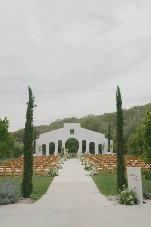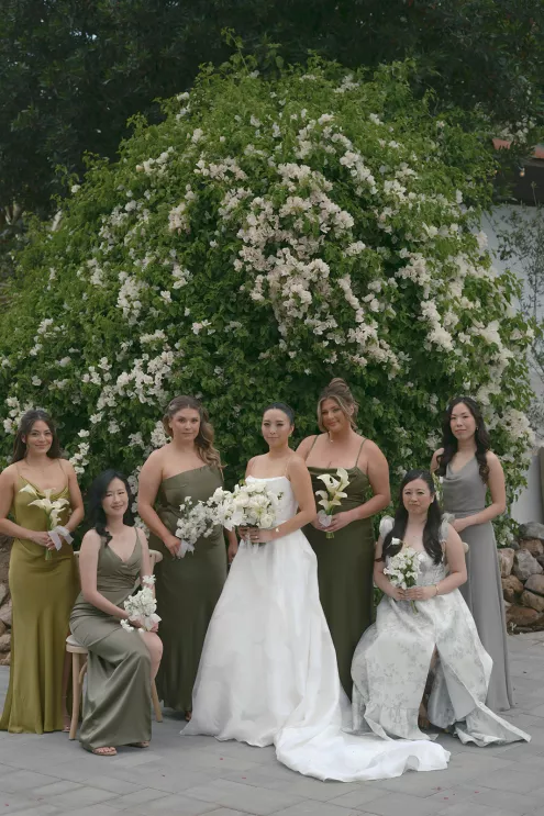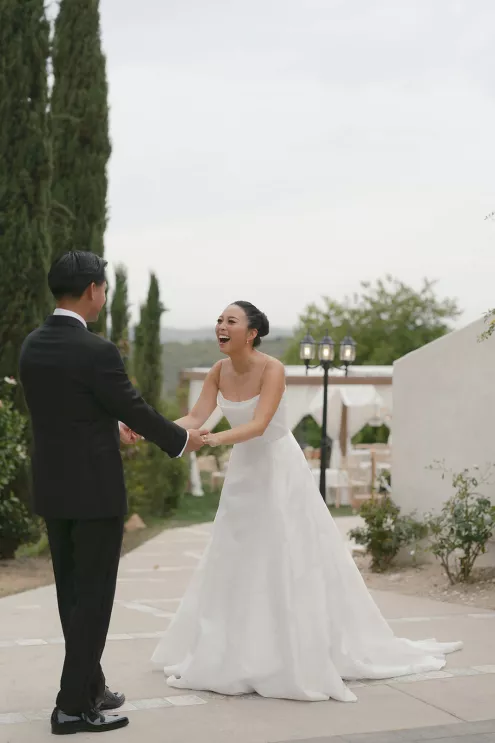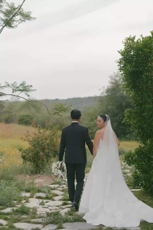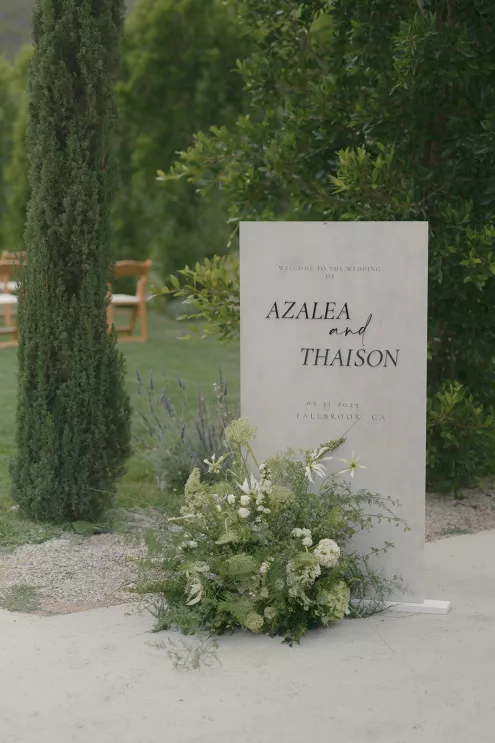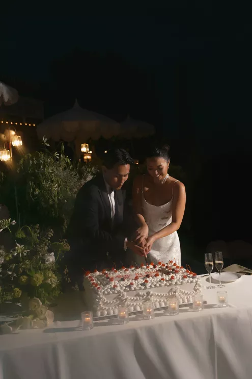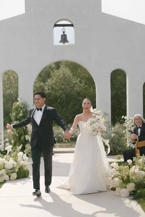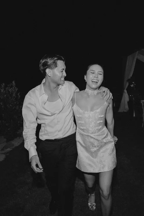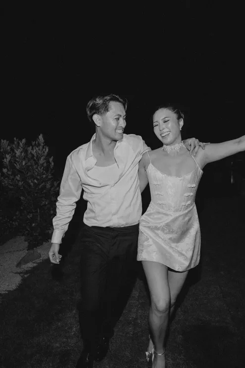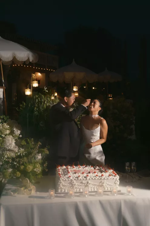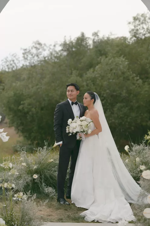 Azalea and Thaison’s wedding day at Jeune Perché embodied both the intimate warmth of the bride’s youth and the joyful exuberance of the groom’s large family. Climbing vines and soft florals created an ethereal ambiance, balanced by modern design elements such as long-stemmed calla lilies and a geometric outdoor ceremony structure. Azalea walked down the aisle to a custom piano cover of their song, “Still Into You” by Paramore, wearing a simple scoop-neck A-line gown. Following the ceremony, guests received endless pours of Hennessy—a staple of Vietnamese celebrations—alongside custom cocktails. Romantic drapery wafted in the wind around the reception space, transporting friends and family to a garden dinner party filled with love and laughter. The after-party began with Azalea’s outfit change into a fashion-forward Chinese qipao mini, setting the tone for a night of joyous revelry. Nostalgia was the dessert du jour, with the couple opting for a sheet cake from a local Asian bakery that recalled youthful celebrations. “It really is just as everyone says—it’s a once-in-a-lifetime kind of magic,” Azalea reflected. “My advice? Feel all the feelings, let go of perfection and soak in every second. It’s worth it.”