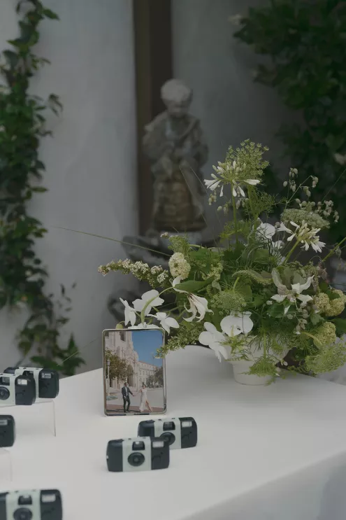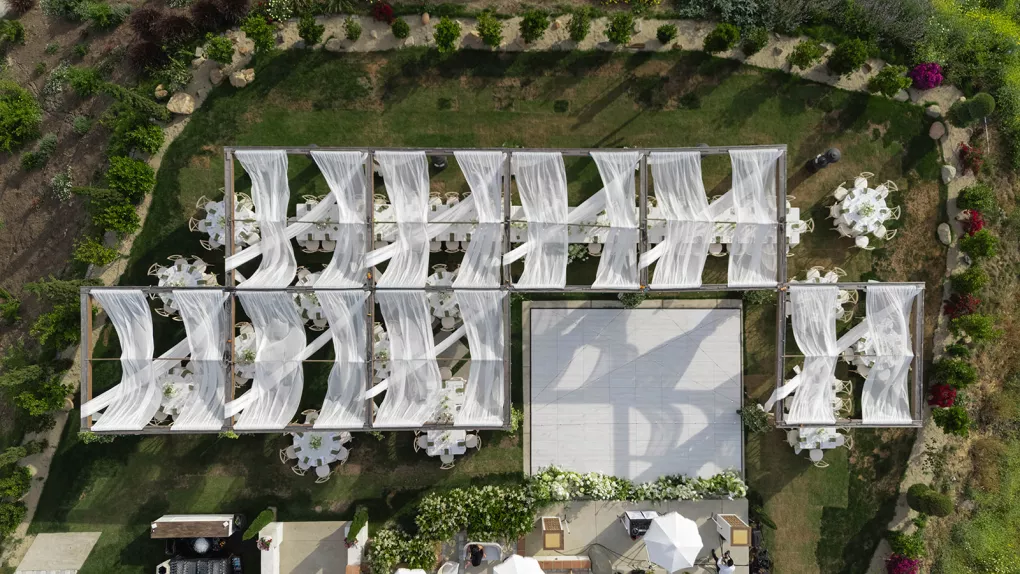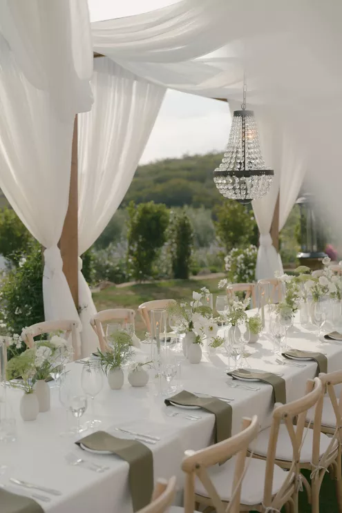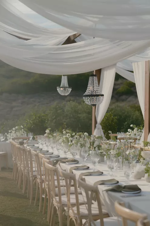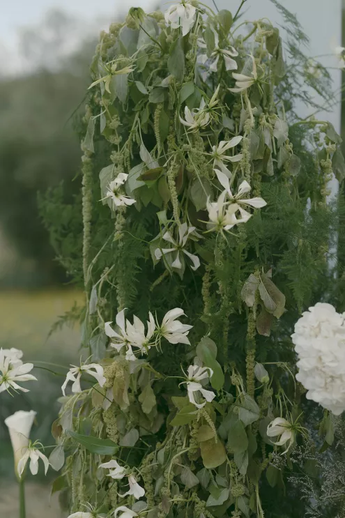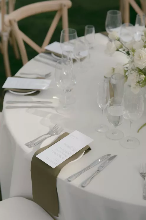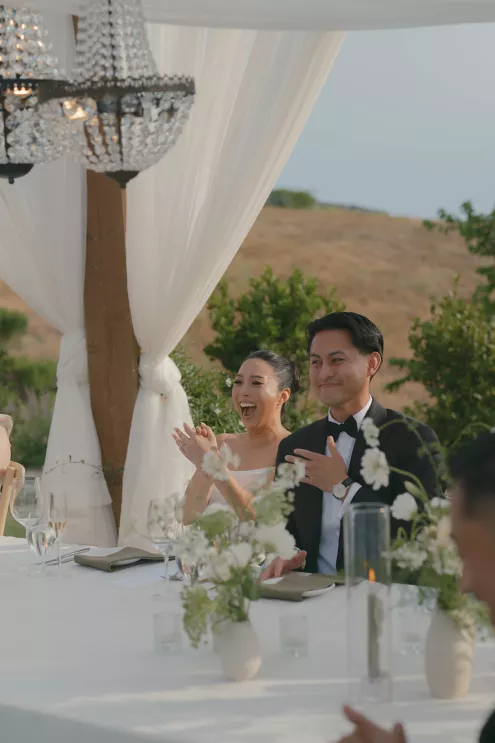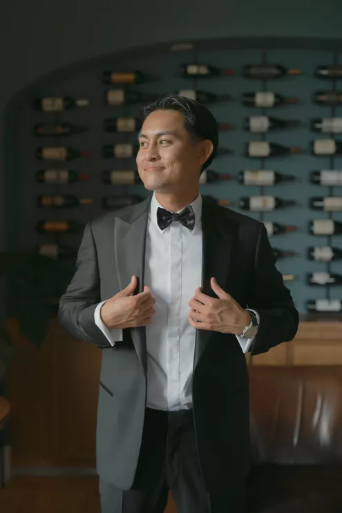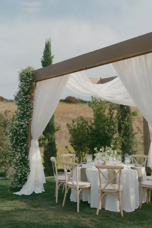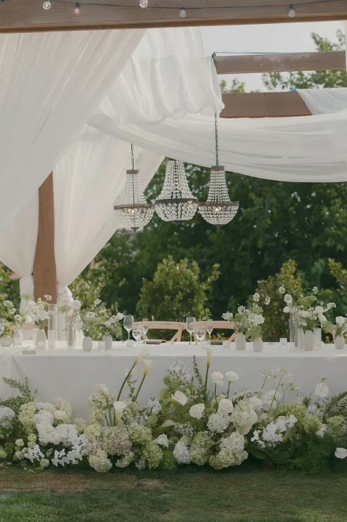 Azalea and Thaison’s wedding day at Jeune Perché embodied both the intimate warmth of the bride’s youth and the joyful exuberance of the groom’s large family. Climbing vines and soft florals created an ethereal ambiance, balanced by modern design elements such as long-stemmed calla lilies and a geometric outdoor ceremony structure. Azalea walked down the aisle to a custom piano cover of their song, “Still Into You” by Paramore, wearing a simple scoop-neck A-line gown. Following the ceremony, guests received endless pours of Hennessy—a staple of Vietnamese celebrations—alongside custom cocktails. Romantic drapery wafted in the wind around the reception space, transporting friends and family to a garden dinner party filled with love and laughter. The after-party began with Azalea’s outfit change into a fashion-forward Chinese qipao mini, setting the tone for a night of joyous revelry. Nostalgia was the dessert du jour, with the couple opting for a sheet cake from a local Asian bakery that recalled youthful celebrations. “It really is just as everyone says—it’s a once-in-a-lifetime kind of magic,” Azalea reflected. “My advice? Feel all the feelings, let go of perfection and soak in every second. It’s worth it.”