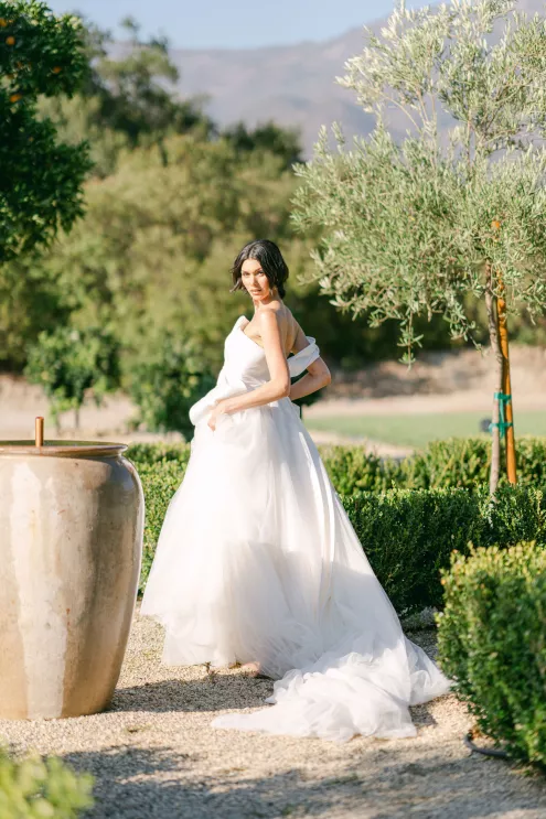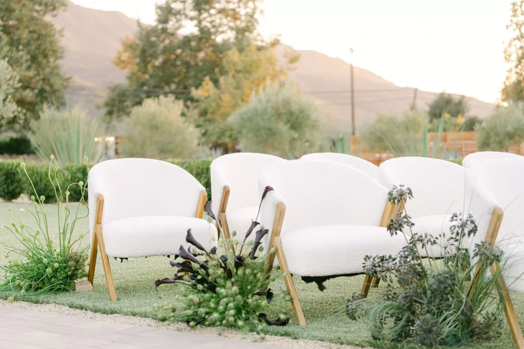 The vastness of the desert meets the lushness of an Italian garden at Ojai’s newest open-air venue, Topa Vista. Located just a few minutes from downtown, the intimate family-owned property is set on 1.8 acres of land dotted with agave plants, olive trees, rocky outcrops and sweeping views of the Topatopa Mountains. In the evening as the sun dips behind the horizon, the mountains and surrounding valley are bathed in pink-tinged light.