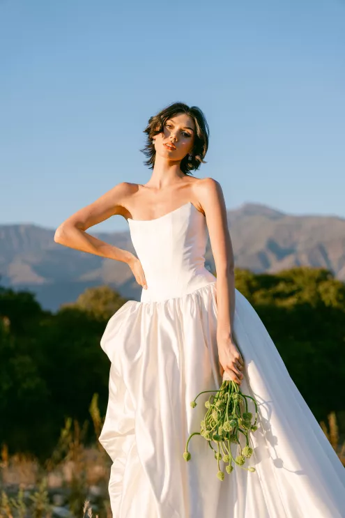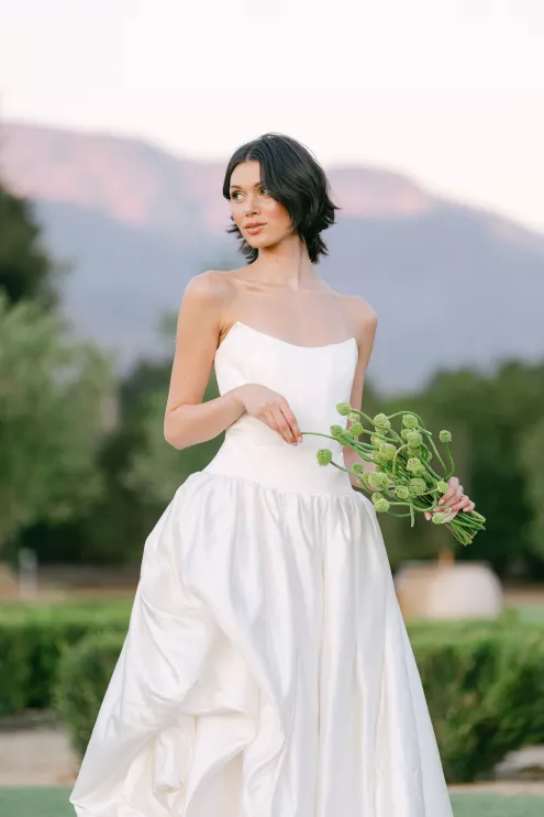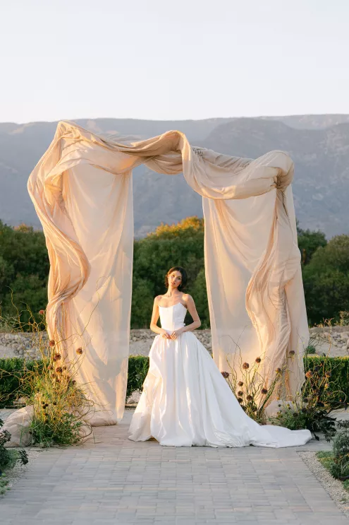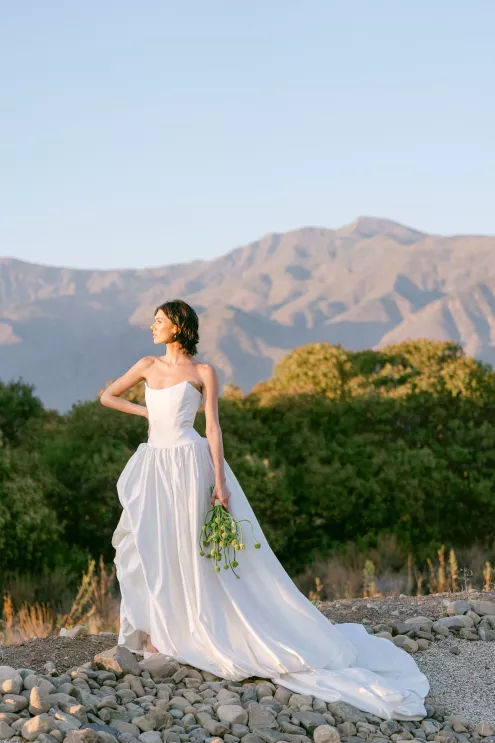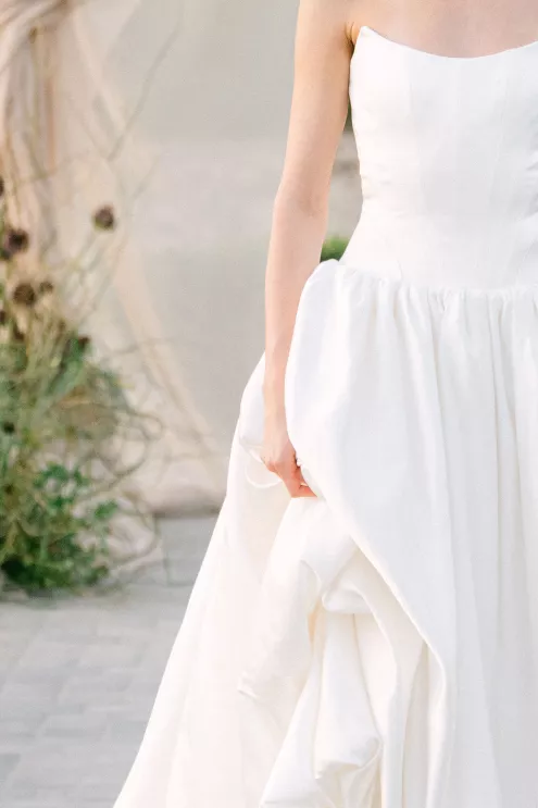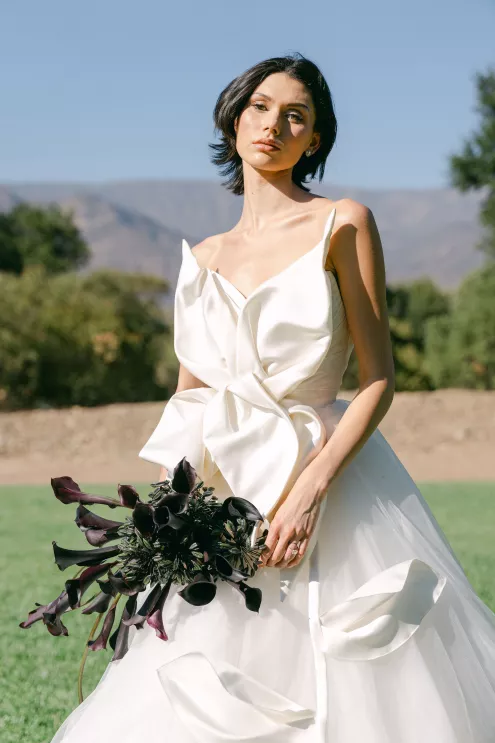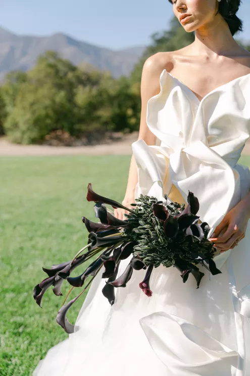 Fashion meets form in Amsale’s “Orchid” gown, a taffeta confection with a bodice adorned with an oversized three-dimensional flower, a fitting match for the uniquely structured calla lily and agapantha bouquet. “My aesthetic is best described as unique, organic and luxurious,” explains Ortega. “I love creating arrangements that feel natural yet elevated with a focus on beautiful textures inspired by sculpture.”