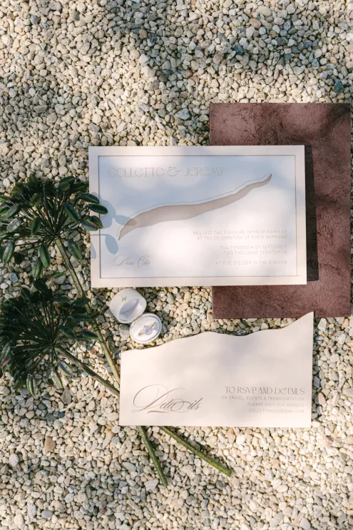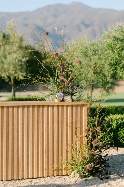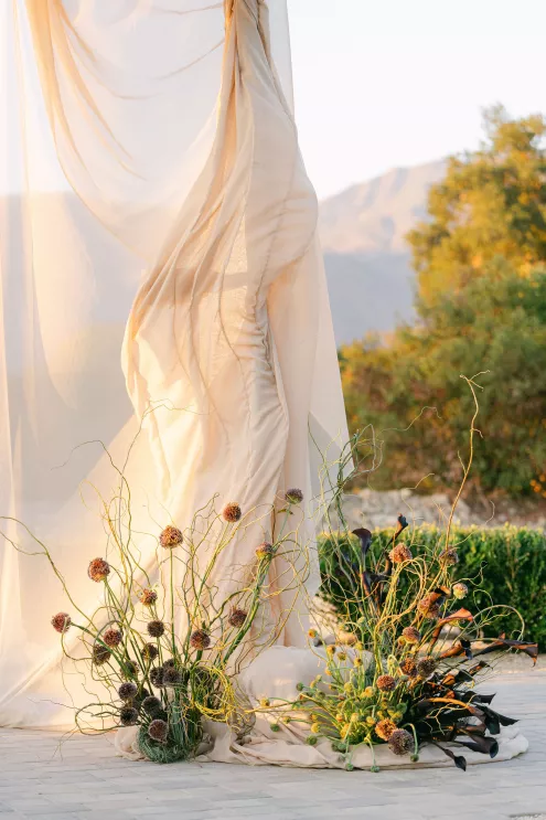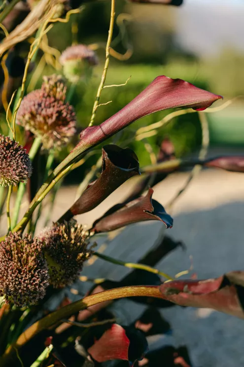 To achieve movement and depth, Orla Floral shaped stems of allium, textured grasses, calla lilies and agapantha pods into organically sculpted arrangements. “We wanted everything to feel sculptural, tonal and modern,” explains Ortega. Deep shades of green meld with notes of eggplant, creating depth and a masculine partner to the gentle rosewater fabric.