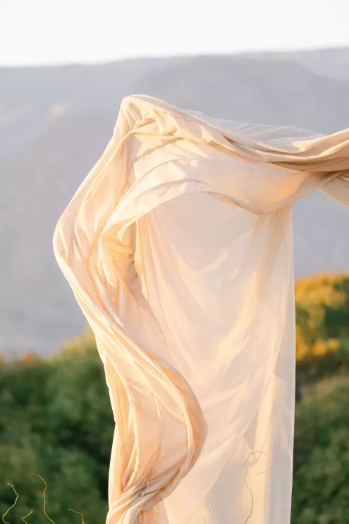 Thus, nature and lighting became the muse for Kristin Banta Events who set about to create a free-standing structure that is architectural yet demure. “The inspiration behind the ceremony design is a marriage of hard and soft,” explains Banta of the airy rosewater-hued structure. Orla Floral shaped the billowing fabric into a breezy asymmetrical altar that frames the mountain vista.