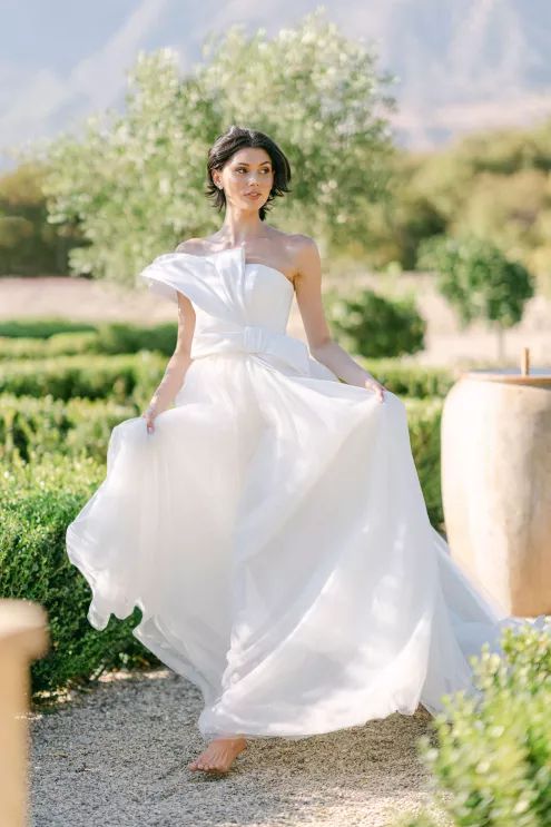 The bride’s avant-garde “Flowerbomb” gown by Viktor & Rolf complements the design with a voluminous tulle skirt and contoured top adorned with a dramatic ribbon fashioned into a bow.