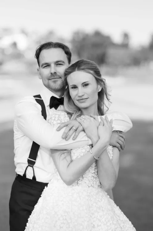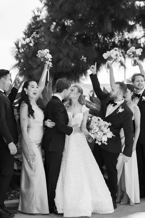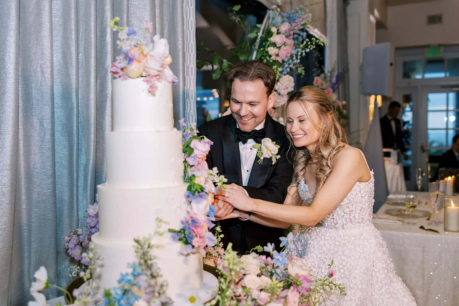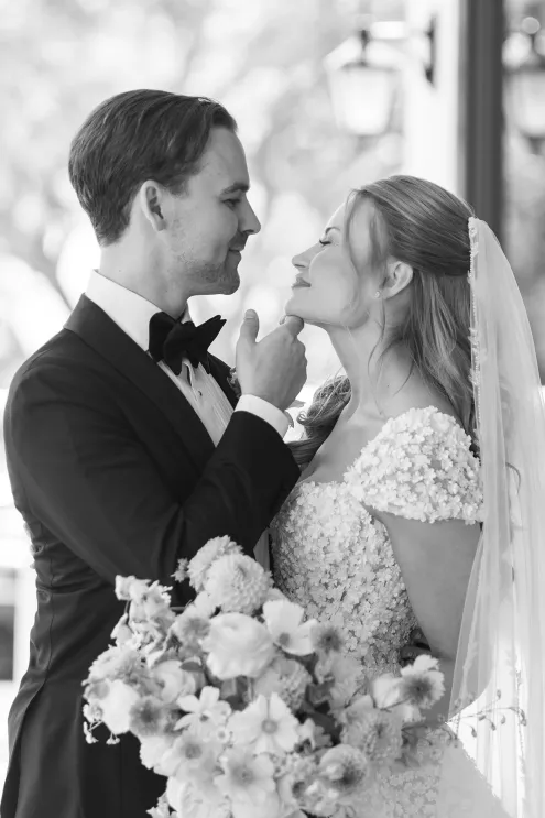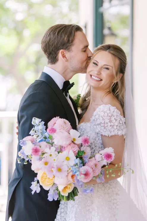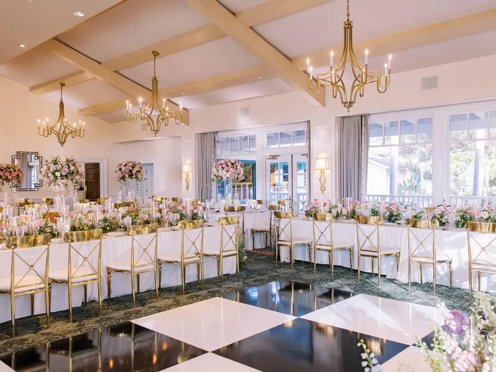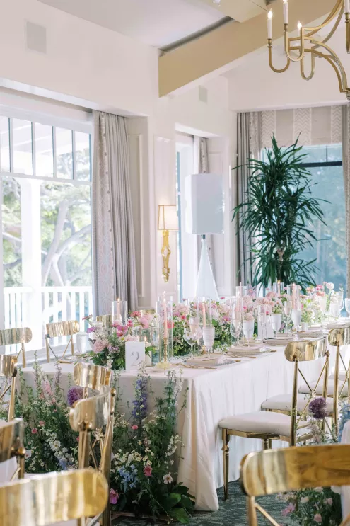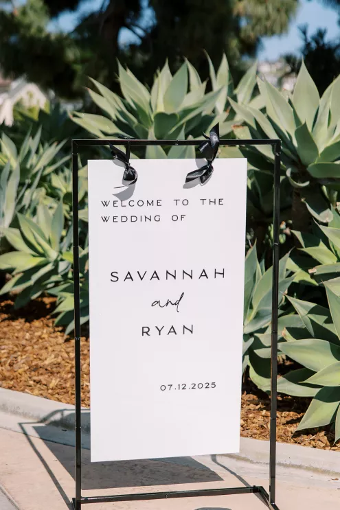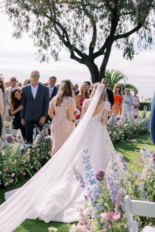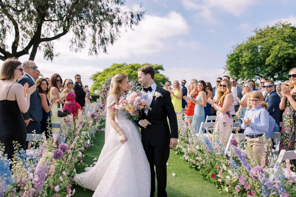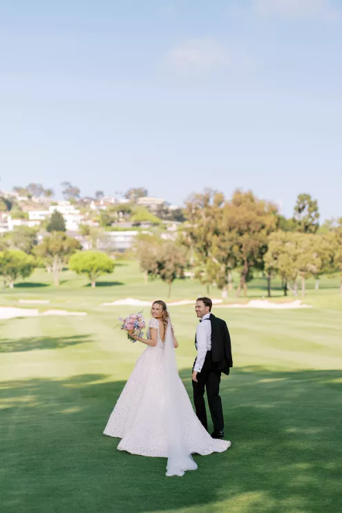 One of Savannah’s fondest childhood memories was watching Fourth of July fireworks at La Jolla Country Club. So when she and fiancé Ryan looked for a wedding venue, the club was the natural choice. Their July celebration borrowed design touches from the bride’s grandmother—her impeccable style, hosting flair and French country–inspired décor—with a pastel palette reflected in the showstopping florals. “I tried to incorporate a lot of color without being too loud, to maintain elegance and class without being too formal or stuffy and to honor the fairytale-princess-girlie-girl in me without losing the focus on our style as a couple,” says Savannah. The golf course ceremony (Ryan is an avid golfer) featured a curated soundtrack of instrumental songs that felt whimsical, sentimental and celebratory. The couple shared their first dance to a customized version of Ed Sheeran’s “Perfect,” accompanied by their DJ on the saxophone. The four-tiered cake was inspired by the bride’s diaphanous Reem Acra couture gown and cut with a treasured knife from—who else—the perennial hostess herself, Savannah’s grandmother.