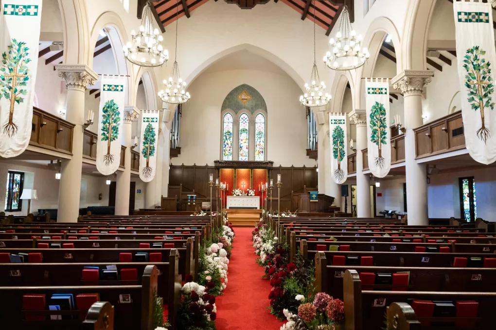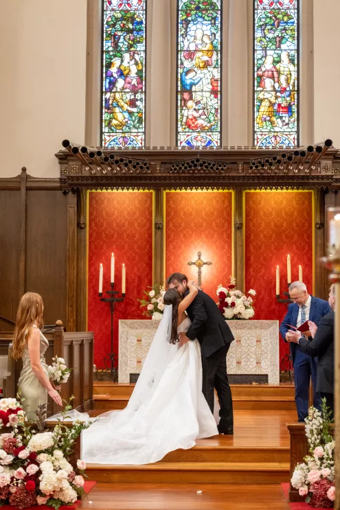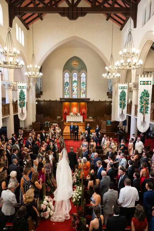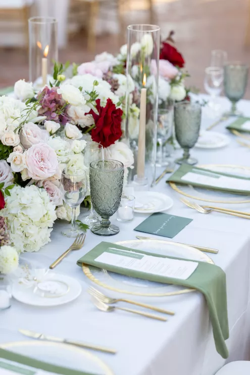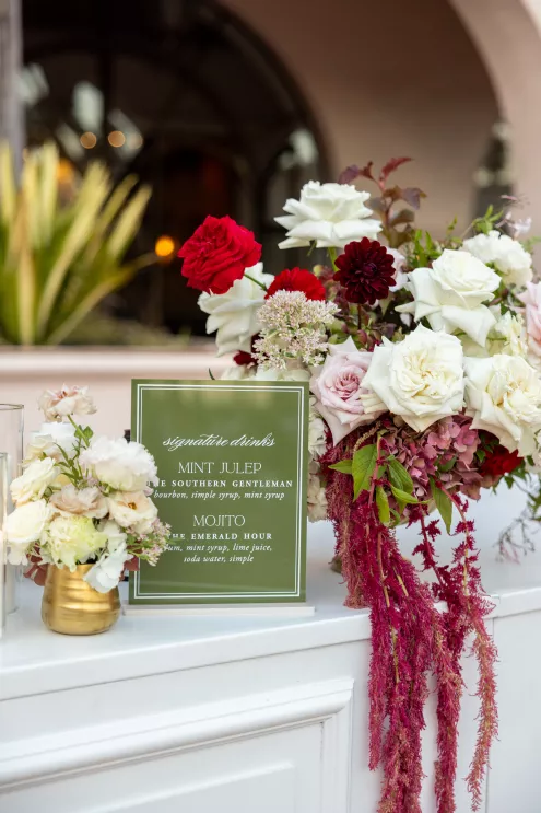 The church’s Spanish-style architecture provided a stunning backdrop for a bright floral design that embraced the warm colors and textures of the desert. Soft ivory roses and red carnations were hugged by mauve and blush-toned blooms, decorating the church aisles and then cascading from the candlelit dining tables and bar at the Hilton.
