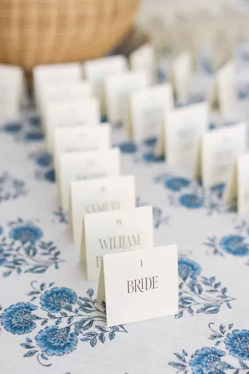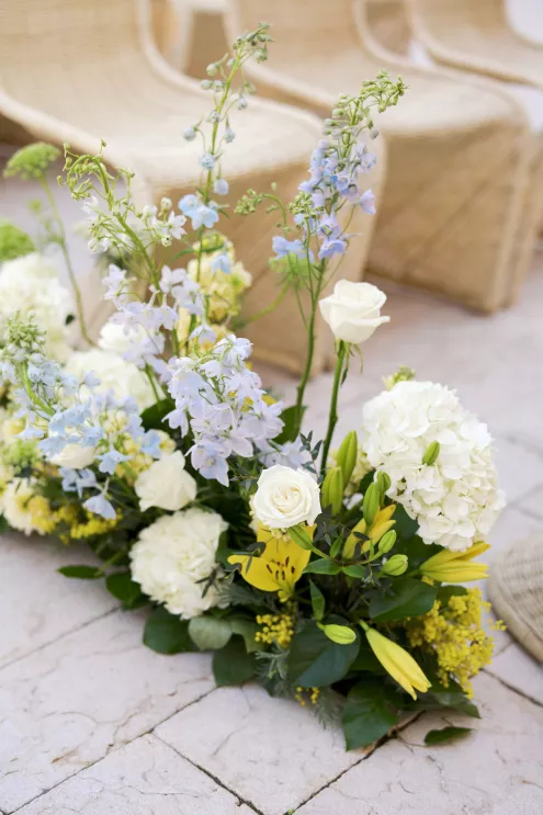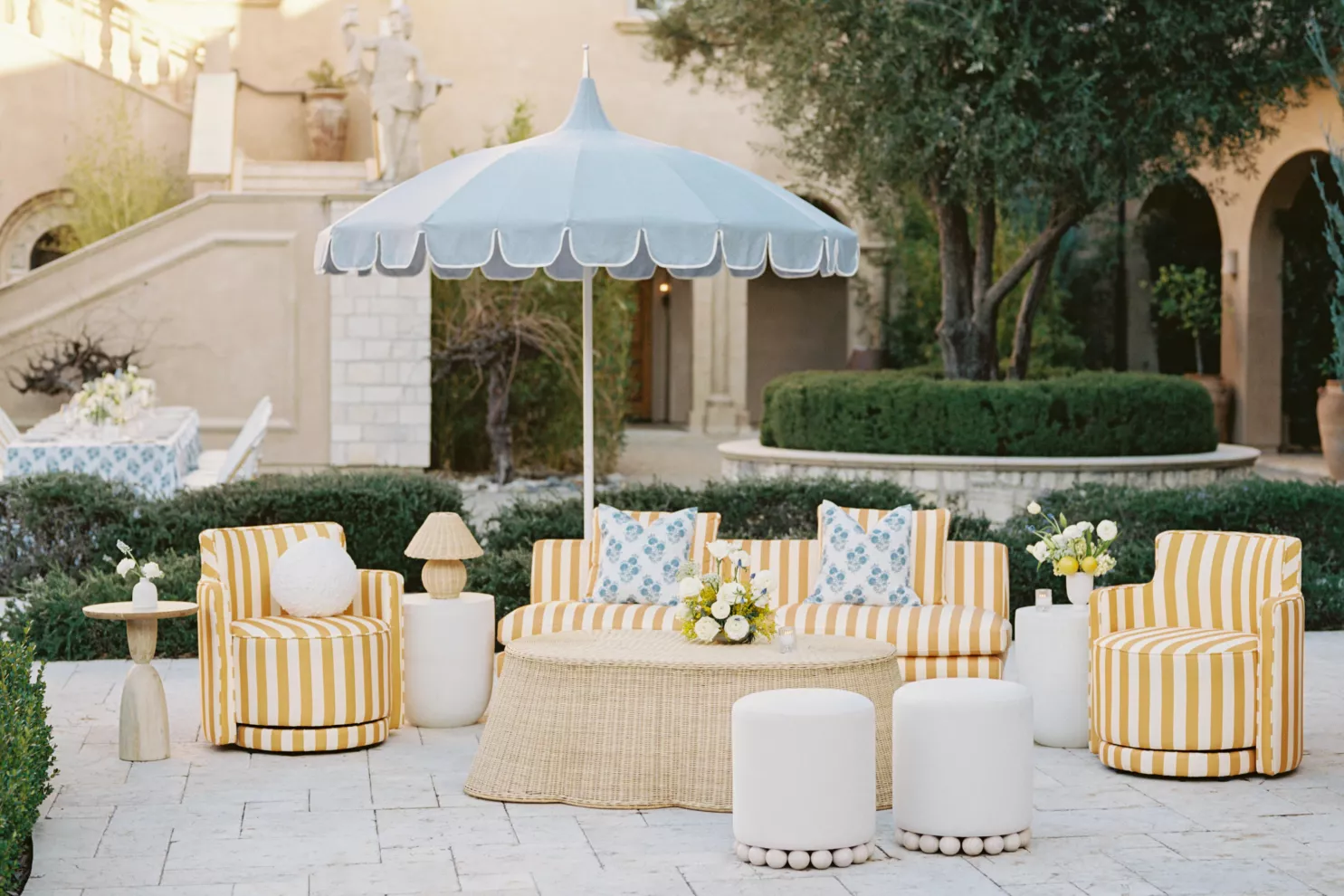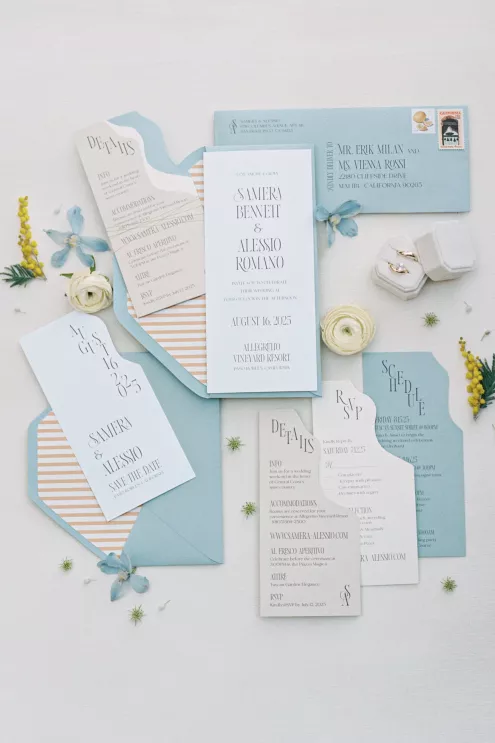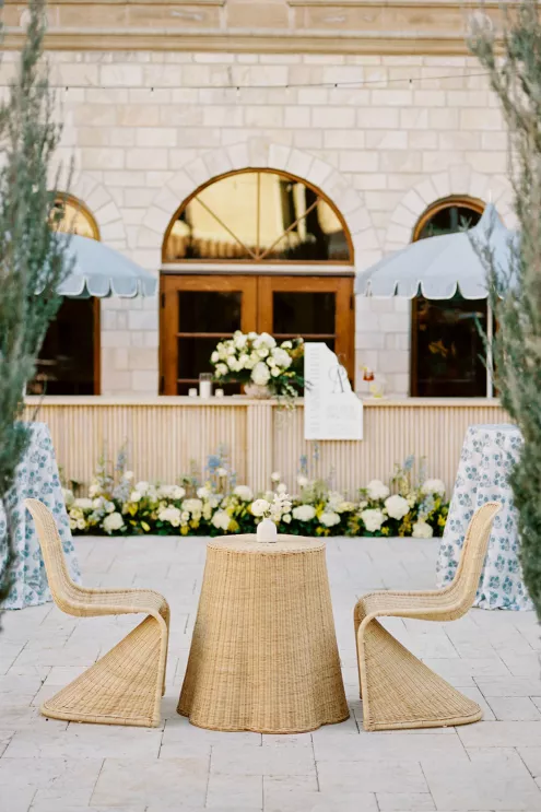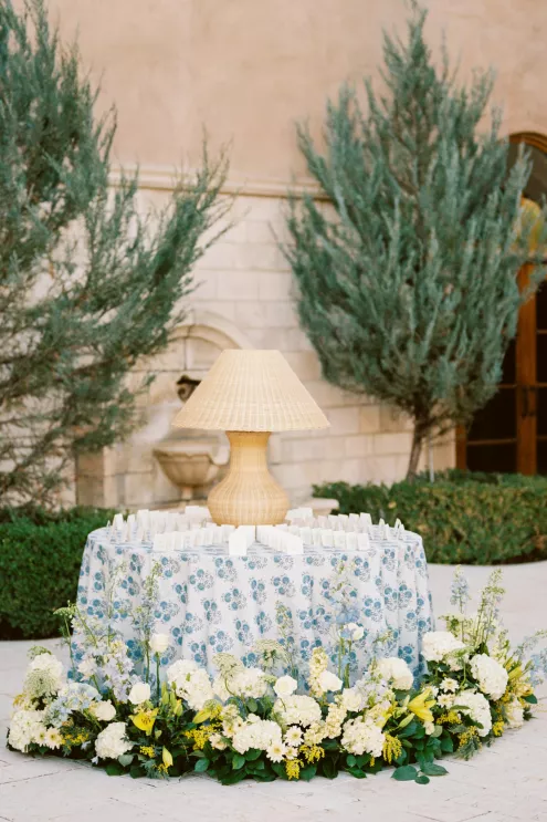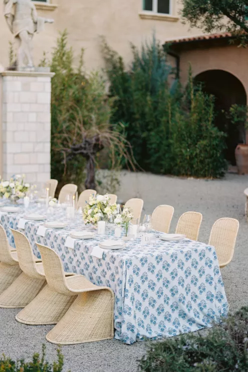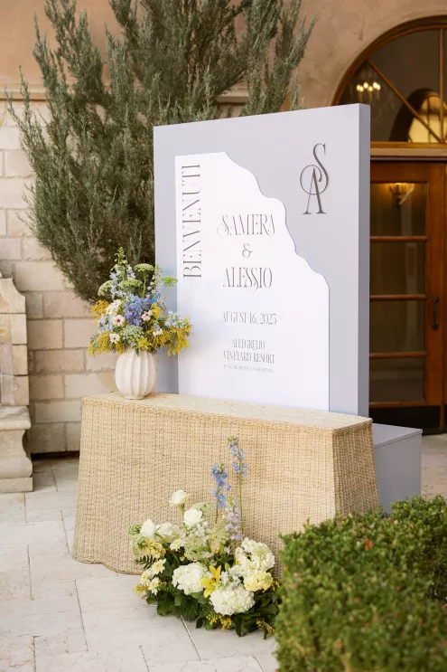 For couples whose wedding mood boards are filled with inspo of far-flung locales, but traveling abroad with their nearest and dearest isn’t an option, consider bringing the destination to you. Here, Avenue Twelve founder, owner and creative director Tommy Rouse captured the spirit of Italy’s sun-drenched Amalfi Coast at the 20-acre Allegretto Vineyard Resort in Paso Robles. “The resort’s architecture shaped the visual direction, blending European charm with California ease,” he says. “We built the palette around soft blue and lemon yellow, complemented by natural textures like wicker and linen, and brought in classic patterns such as stripes, scallops and curved silhouettes.” The result was an airy, joyful and elevated affair. The hand-carved stone fireplace served as a natural altar for the understated ceremony, while the cocktail hour emphasized connection via high and low tables, and the alfresco dinner in the courtyard offered a fresh alternative to trend-heavy settings. “We kept the floral footprint light, allowing candlelight, conversation and generous platters of food to take the spotlight,” Rouse says of the tablescape. “Ruffled napkins and sleek tabletop pieces added charm and character without overpowering the meal.” Bellissimo, indeed.