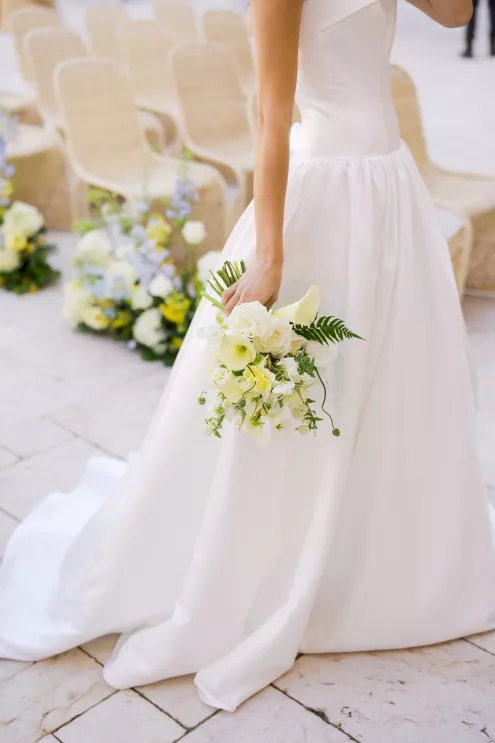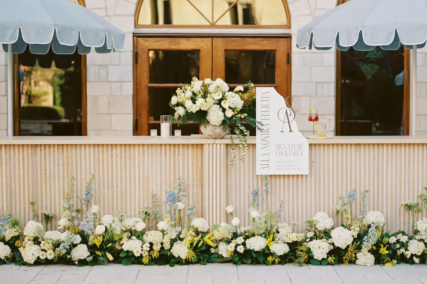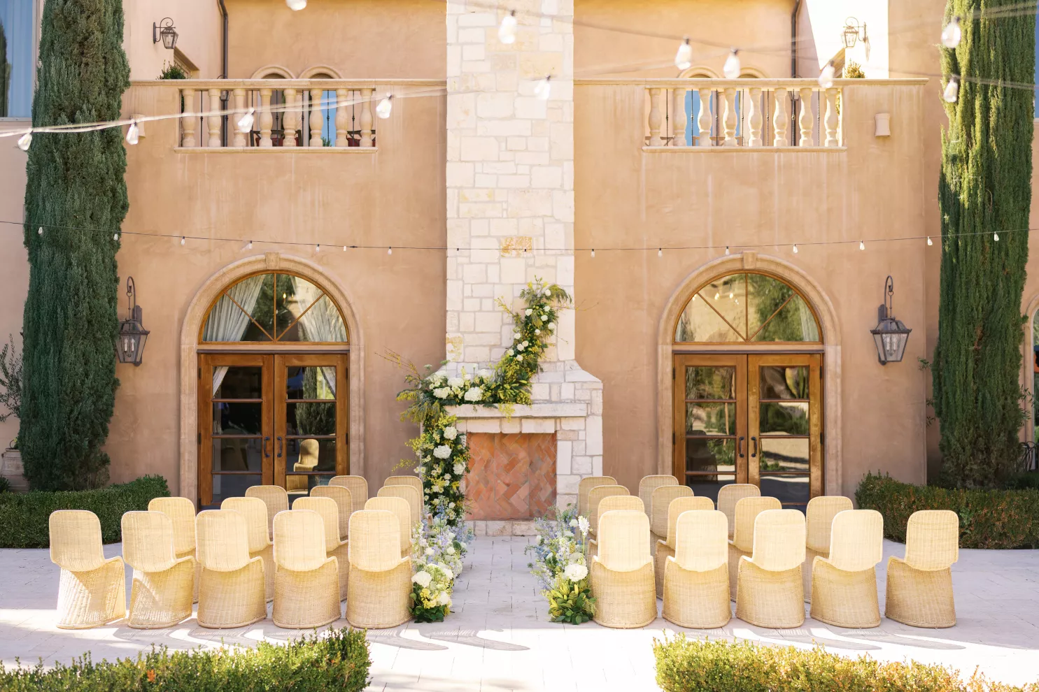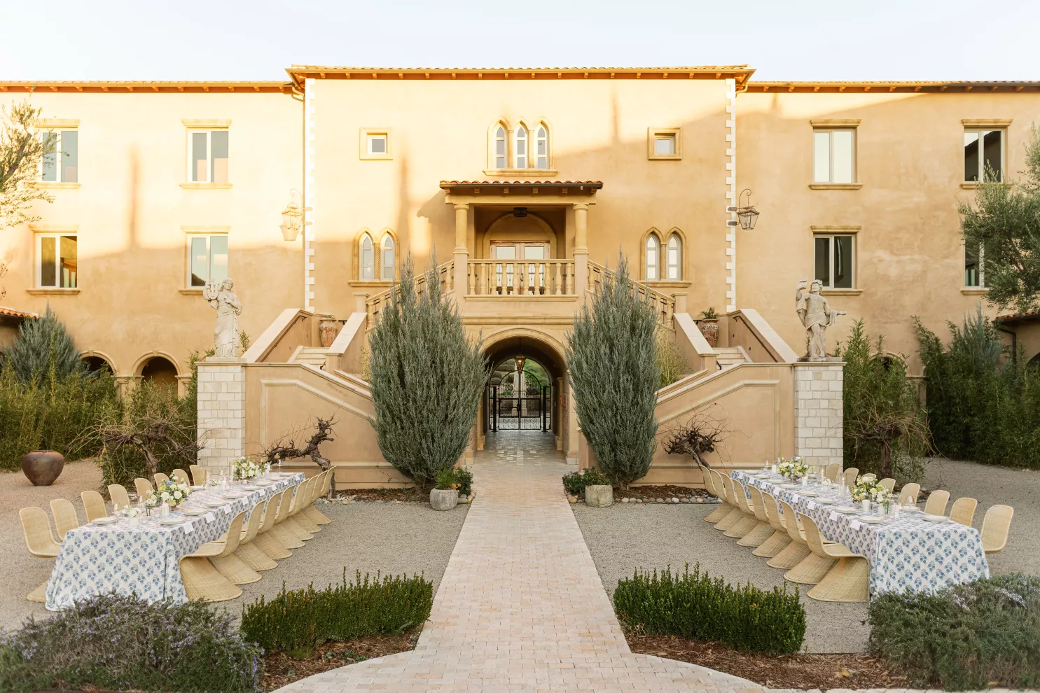 For couples whose wedding mood boards are filled with inspo of far-flung locales, but traveling abroad with their nearest and dearest isn’t an option, consider bringing the destination to you. Here, Avenue Twelve founder, owner and creative director Tommy Rouse captured the spirit of Italy’s sun-drenched Amalfi Coast at the 20-acre Allegretto Vineyard Resort in Paso Robles. “The resort’s architecture shaped the visual direction, blending European charm with California ease,” he says. “We built the palette around soft blue and lemon yellow, complemented by natural textures like wicker and linen, and brought in classic patterns such as stripes, scallops and curved silhouettes.” The result was an airy, joyful and elevated affair. The hand-carved stone fireplace served as a natural altar for the understated ceremony, while the cocktail hour emphasized connection via high and low tables, and the alfresco dinner in the courtyard offered a fresh alternative to trend-heavy settings. “We kept the floral footprint light, allowing candlelight, conversation and generous platters of food to take the spotlight,” Rouse says of the tablescape. “Ruffled napkins and sleek tabletop pieces added charm and character without overpowering the meal.” Bellissimo, indeed.