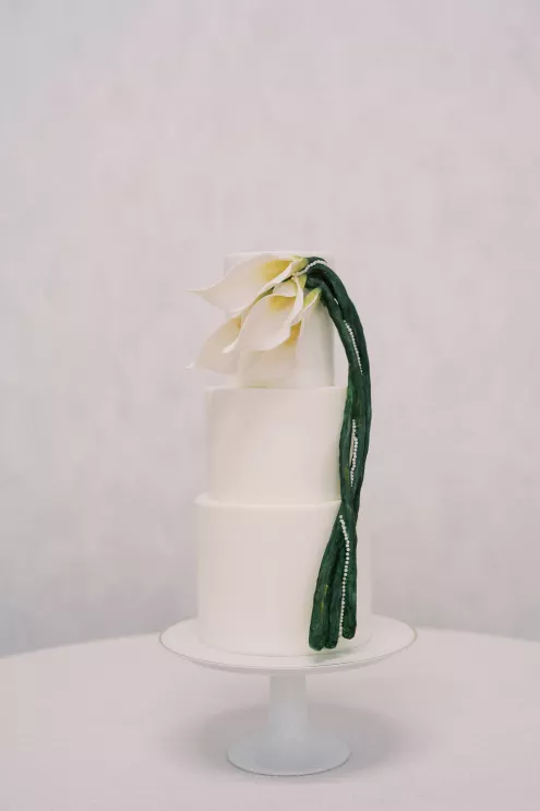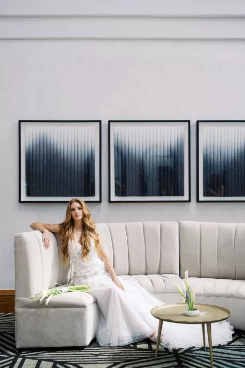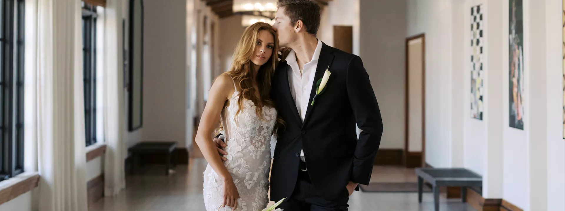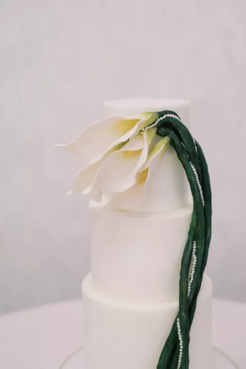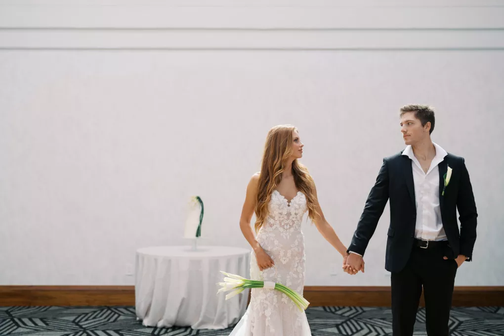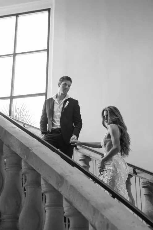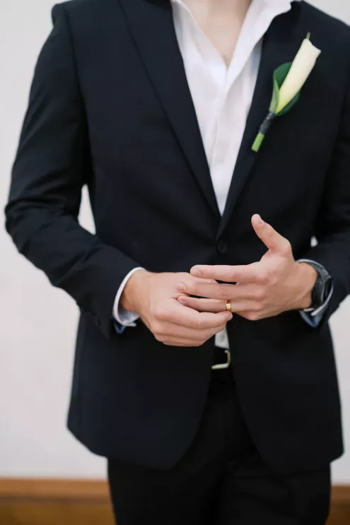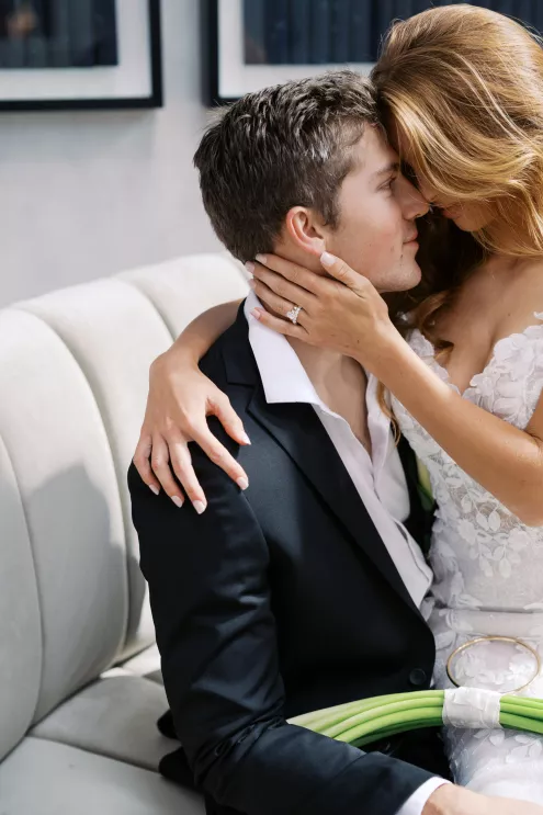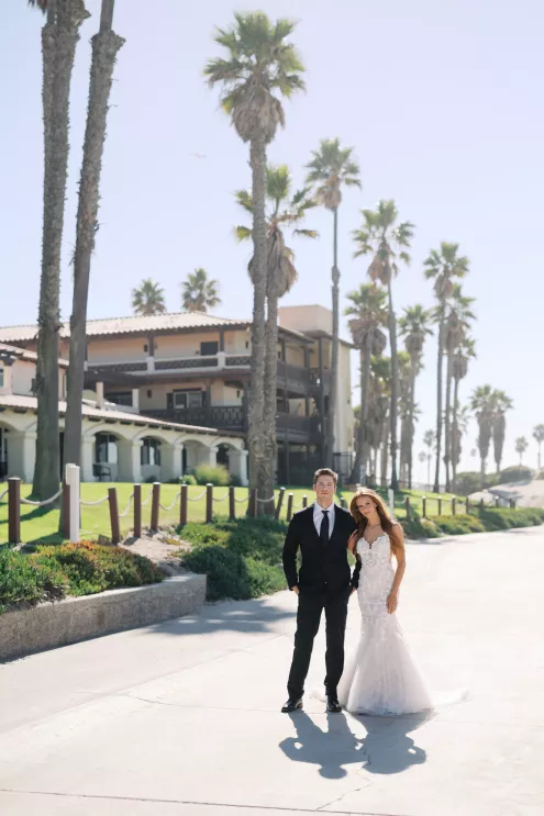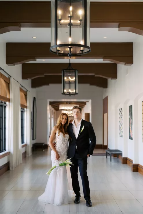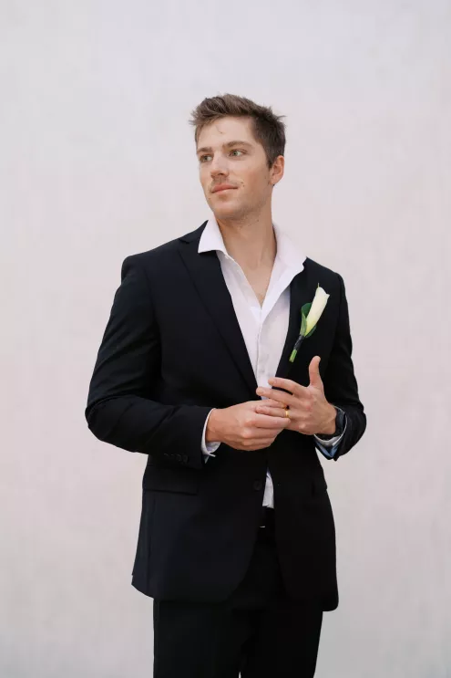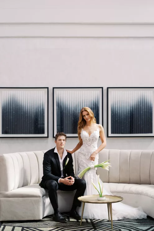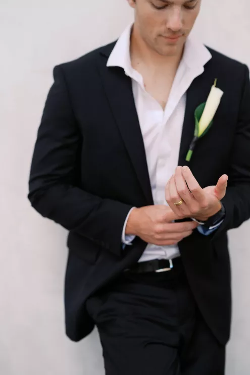 A highlight of the design was the purse bouquet: a sculptural take on traditional florals that transformed the bride's look into a true fashion statement. The bride carried her calla lilies like an accessory, perfectly complementing her sleek lace gown. The groom's effortlessly classic black suit was vintage-casual, featuring an open front and a collar-over-lapel style first popular in the 1930s and 1970s. Together, they embodied the spirit of modern wedding style in California: elevated and effortless.
