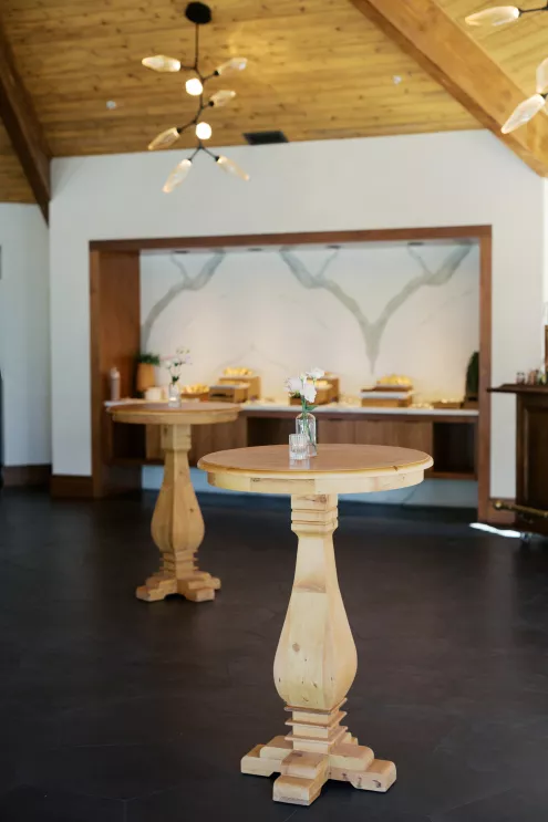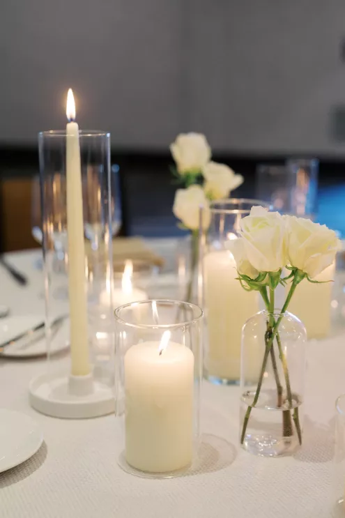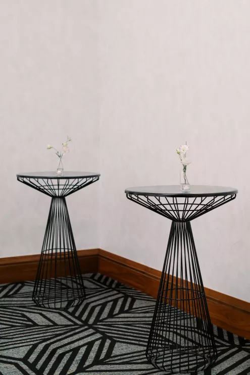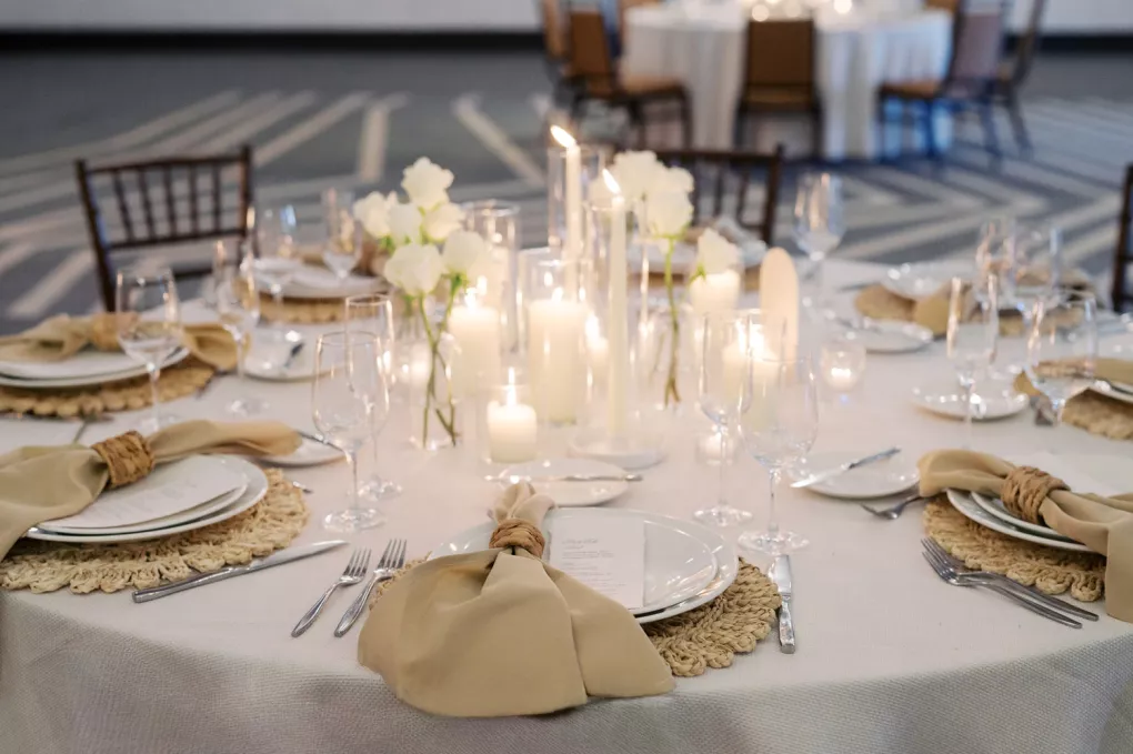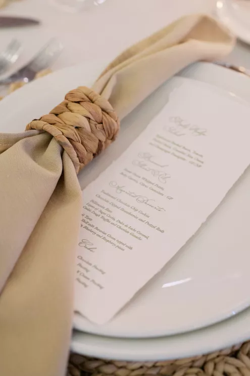 Inside, the aesthetic transitioned seamlessly into a modern coastal reception. Minimalist black wire cocktail tables and natural wood high-tops offered a stylish contrast to the resort's contemporary interiors. At the reception tables, layers of woven textures, creamy blooms and soft candlelight cast a golden glow — perfect for a romantic coastal wedding dinner that felt both modern and timeless. Each place setting featured knotted linen napkins, hand-torn menus and flickering pillar candles that brought warmth and intimacy to the space.