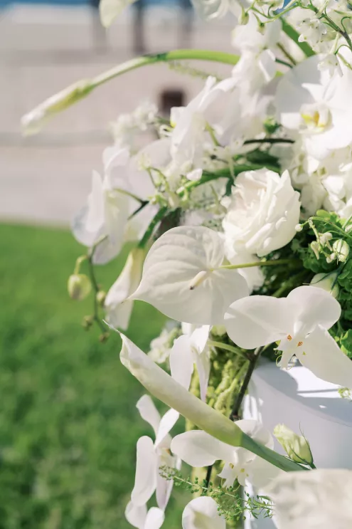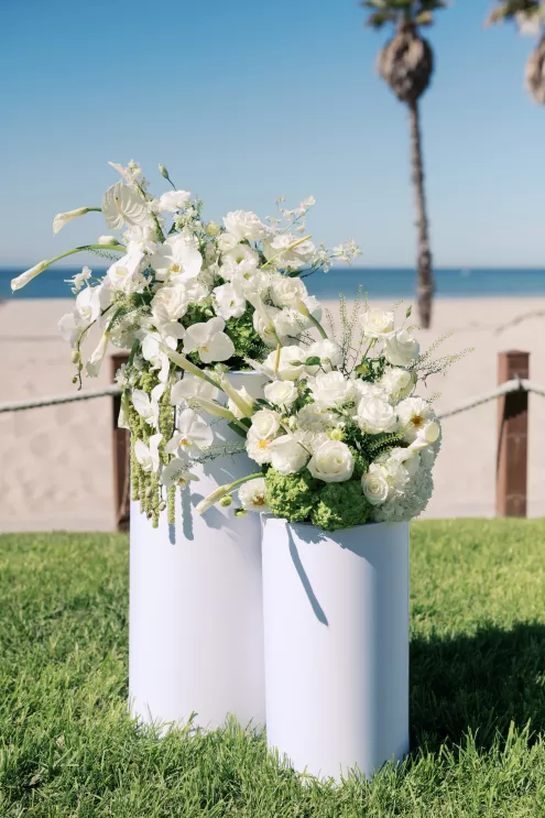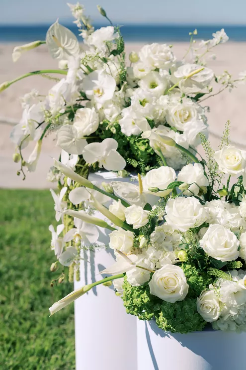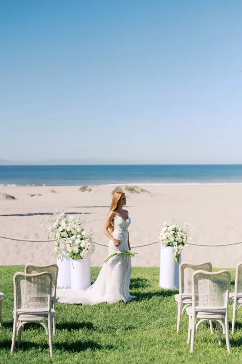 The day began with an intimate ceremony setup overlooking the sand and sea, where sleek white chairs framed a grassy aisle leading to sculptural floral arrangements in ivory and green. Beneath the endless blue sky, the soft sound of waves created a natural soundtrack for the designed "I do's," exuding quiet sophistication.