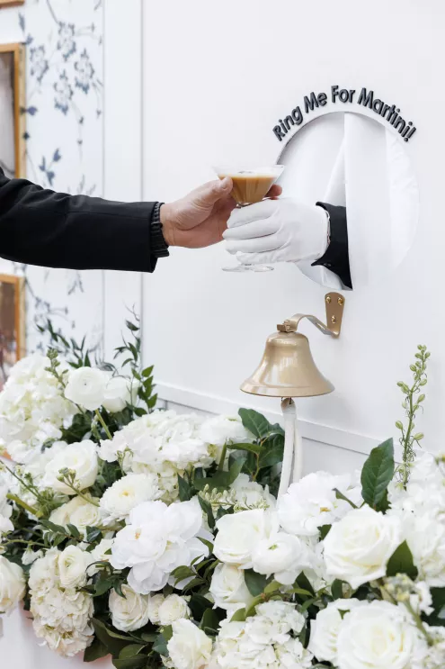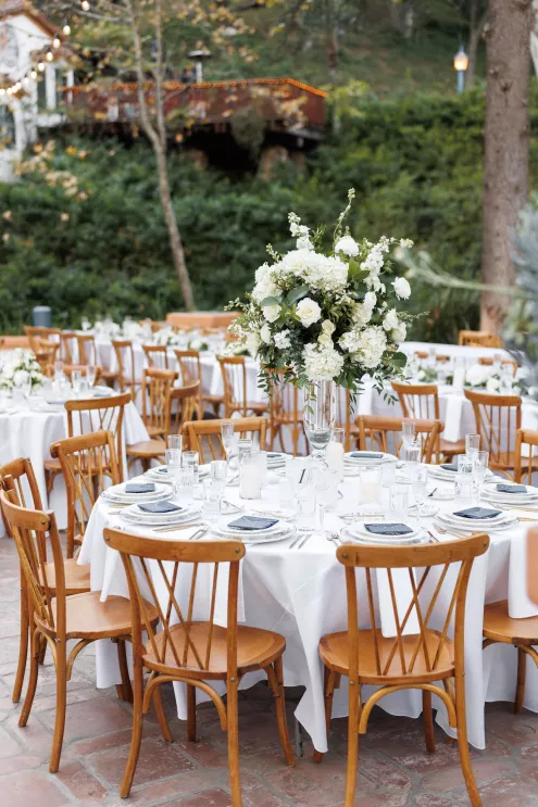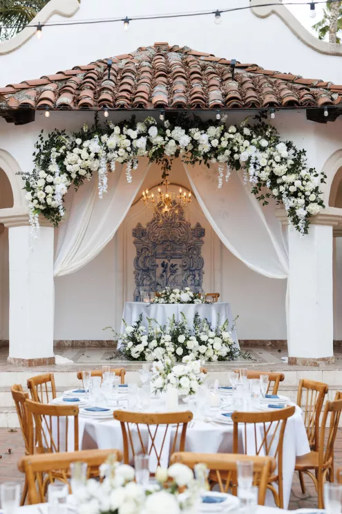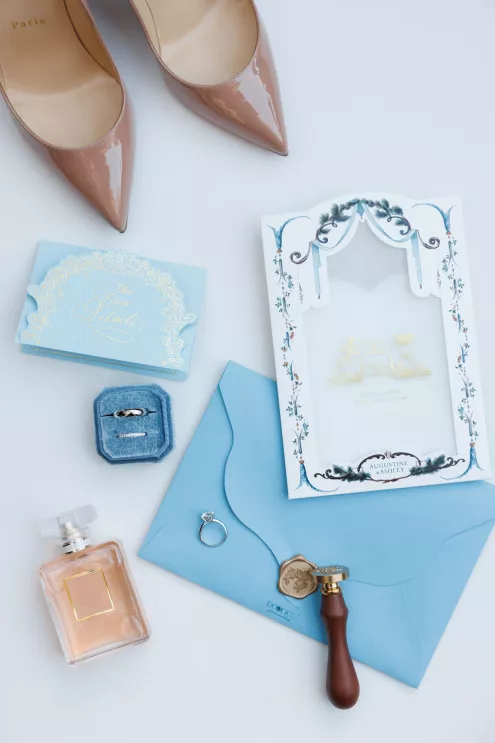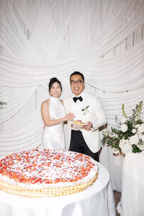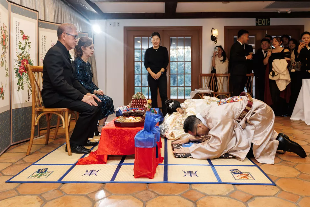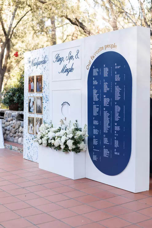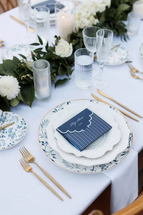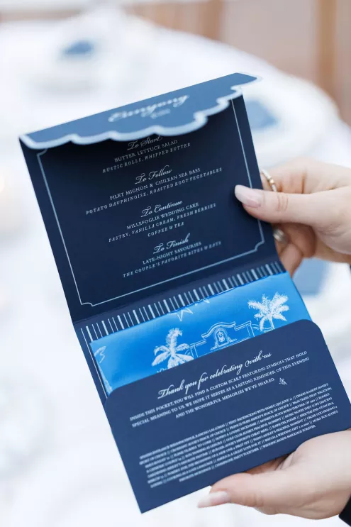 The design reflected the couple's heritage, creating a meaningful experience throughout. A refined blue accent palette ran through the decor alongside specialty tabletop rentals and custom menus from Korea. When guests opened those menus, they found a handcrafted scarf inside featuring an illustration of the venue. A custom letter written to each individual guest ensured no one in the room felt like a number. Live sketch artists captured intimate moments throughout the day and a bossa nova band played through cocktail hour and dinner, a nod to the music that soundtracked the early days of their relationship during the COVID era.