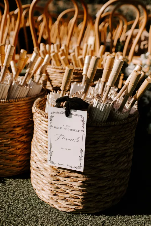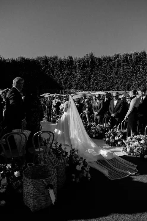 For the ceremony, Taylor embraced timeless romance in an Anne Barge gown fit for a princess, with a structured silhouette, full skirt and delicate detailing. Beneath the hem, a pair of cowboy boots nodded to her country roots—a playful juxtaposition against the grand chuppah framed in lush florals. The guests shaded themselves under paper parasols as Taylor walked halfway down the aisle alone, pausing midway so that her divorced parents could join her in a symbolic gesture of independence and unity.