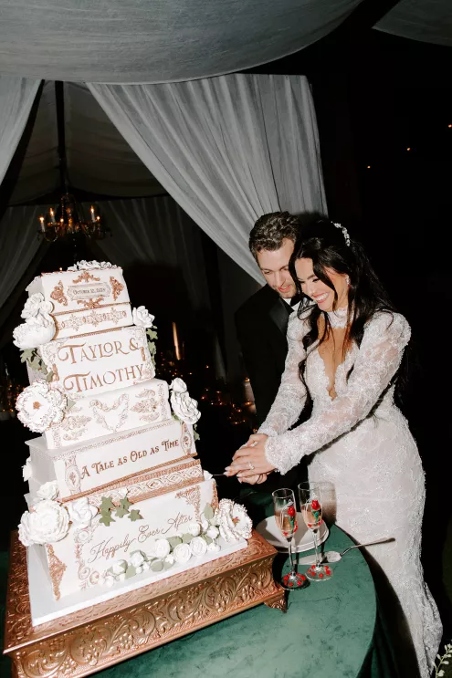 As twilight gave way to celebration, Taylor slipped into a Netta Benshabu masterpiece. The gown’s body-skimming lines and luminous embellishments shimmered against the venue’s verdant backdrop. “The design leaned into soft neutrals white, taupe and green paired with velvet textures, French toile, and subtle nods to Beauty and the Beast,” says Taylor. “We incorporated everything we love: live music, worship elements, signature cocktails, vintage details and meaningful moments with family and friends.” A few of the Disney touches included a seated dinner served to “Be Our Guest,” a book-inspired cake and a choreographed first dance to “Tale as Old as Time.”