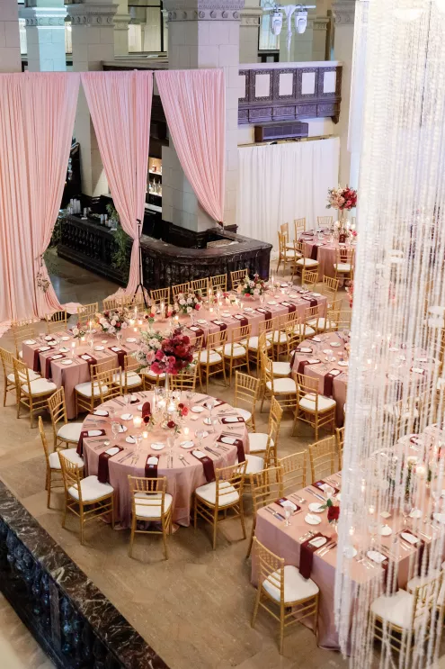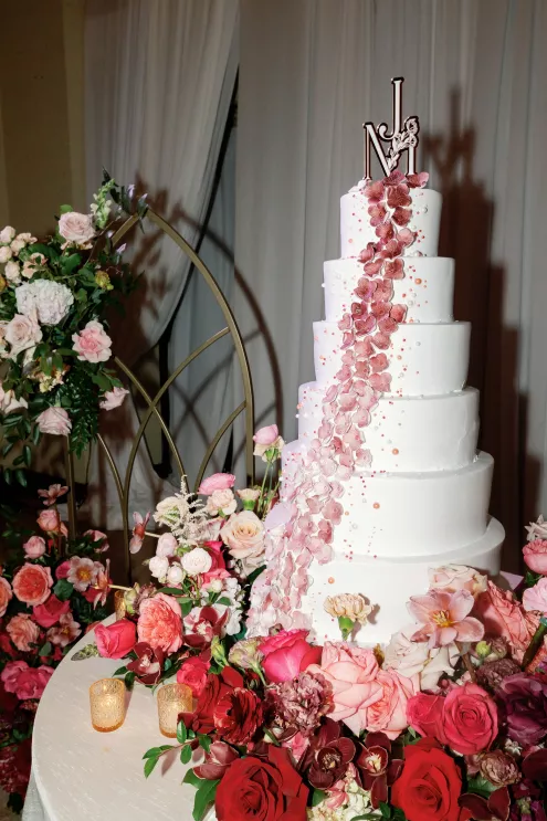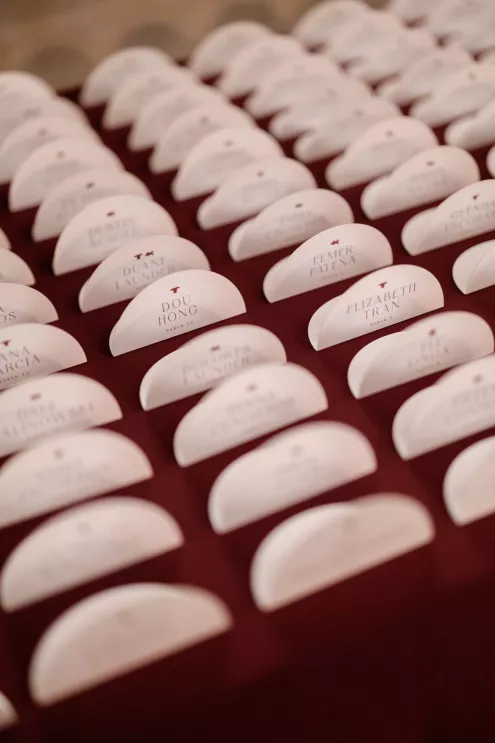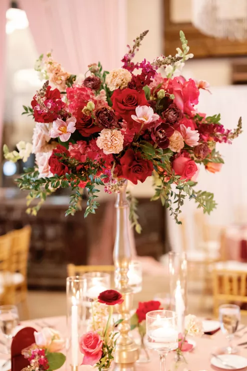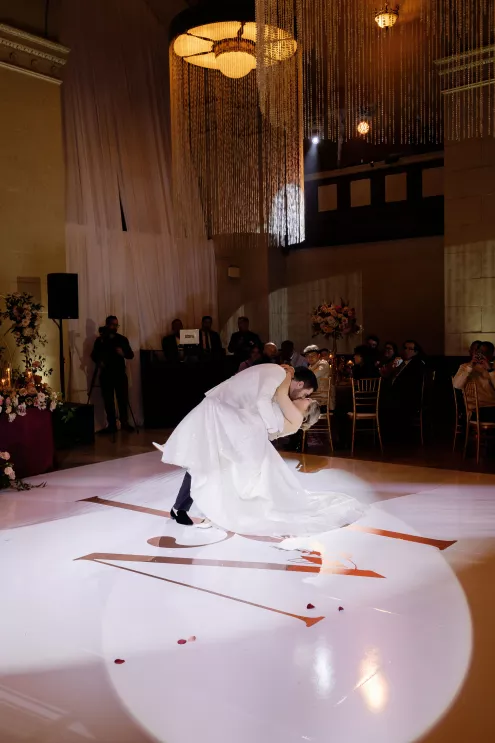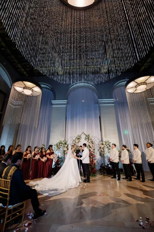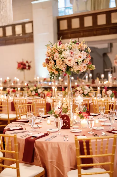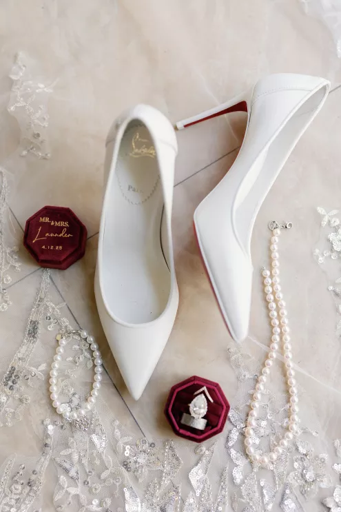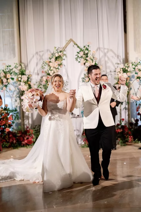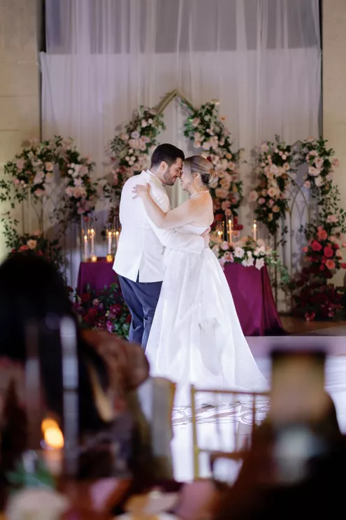 On the wedding day, lush florals framed the altar as the bride made her entrance in a sparkling ball gown styled with Tiffany pearls and signature Louboutin heels. A refined palette of burgundy, blush, rose gold and soft red accents carried through the design, setting a romantic tone without feeling overly formal. Thoughtful touches — like personalized favors at each place setting — reflected the couple's attention to detail and love of gift-giving.