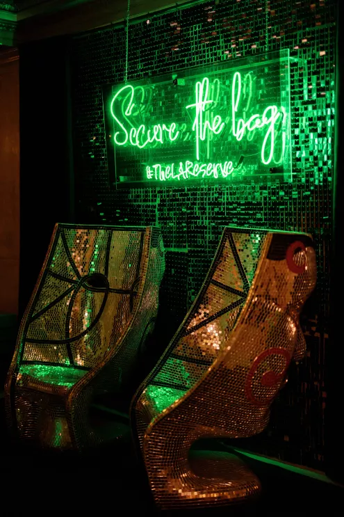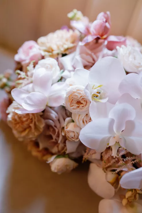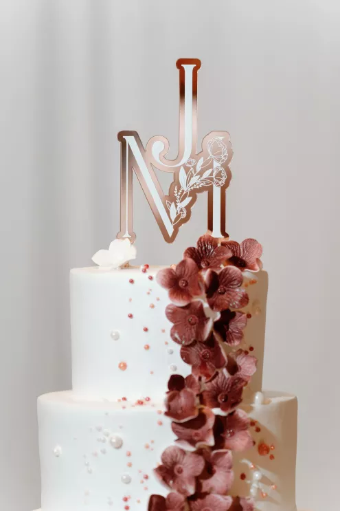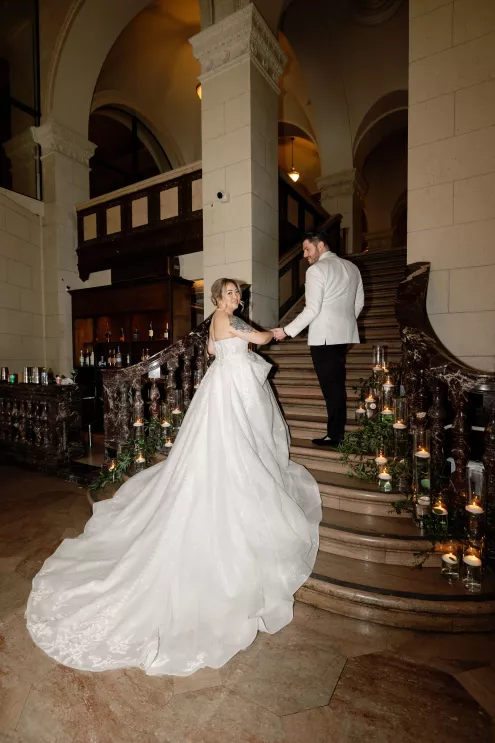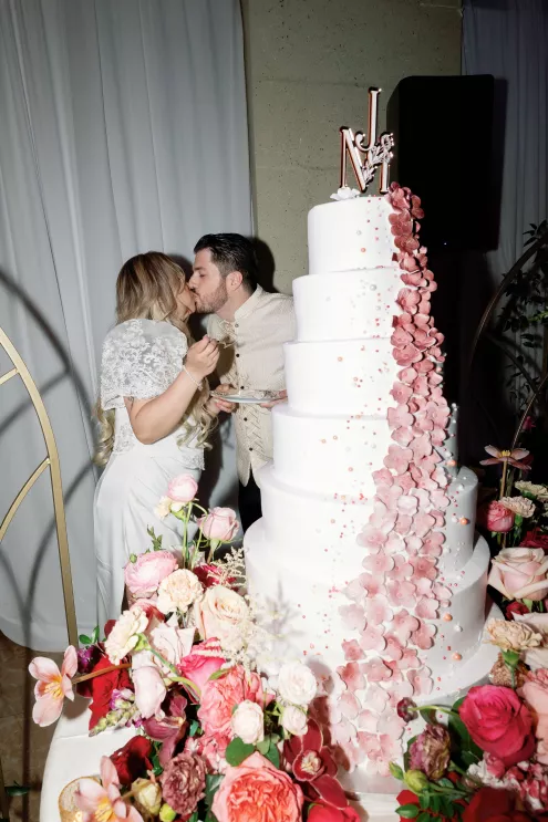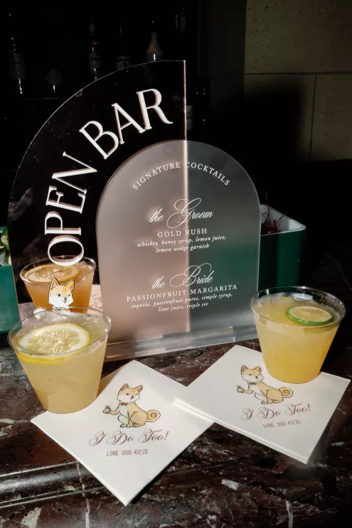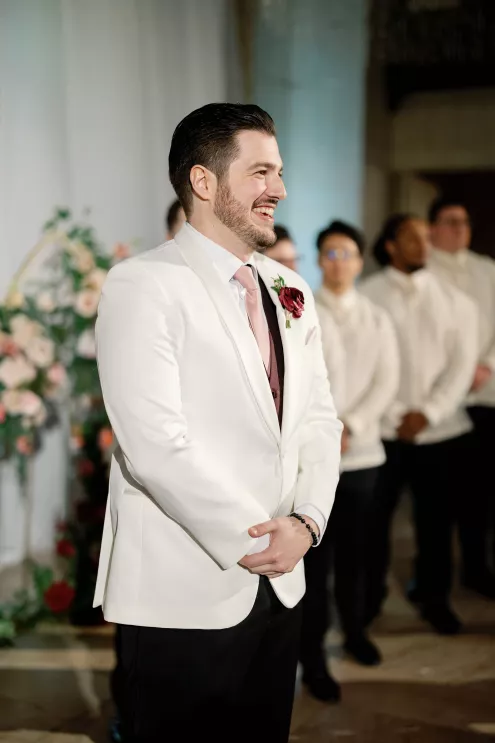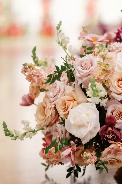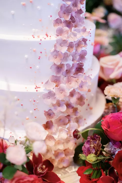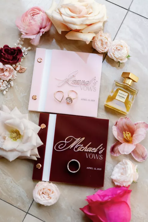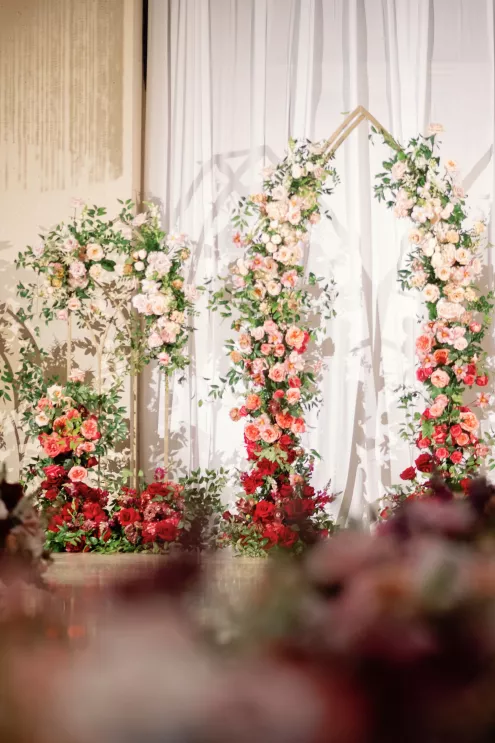 On the wedding day, lush florals framed the altar as the bride made her entrance in a sparkling ball gown styled with Tiffany pearls and signature Louboutin heels. A refined palette of burgundy, blush, rose gold and soft red accents carried through the design, setting a romantic tone without feeling overly formal. Thoughtful touches — like personalized favors at each place setting — reflected the couple's attention to detail and love of gift-giving.