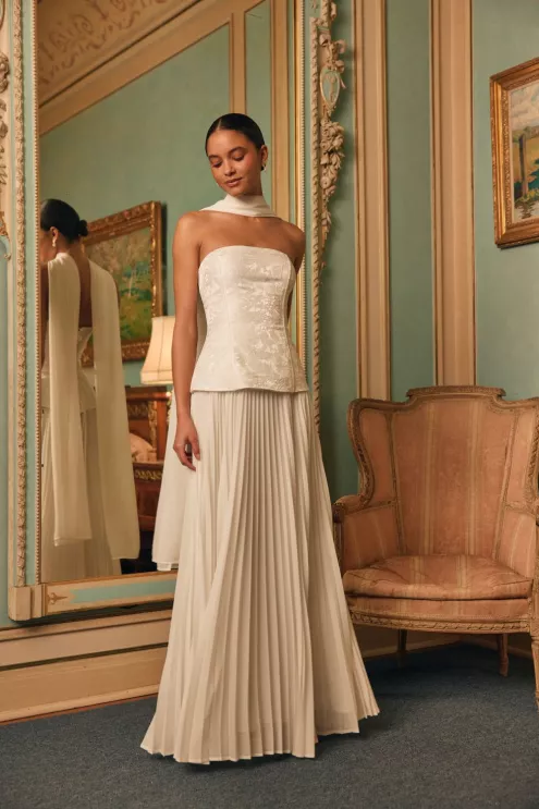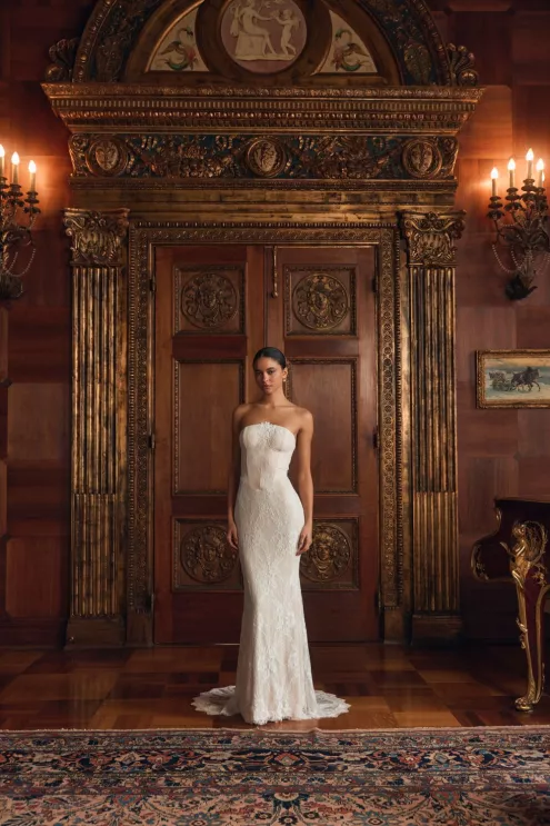 “What I’m loving most for Spring 2026 is the way bridal fashion is balancing quiet, editorial minimalism with bold, sculptural moments,” Fluker says. “Sleek satin and column silhouettes give brides an effortless modern elegance, while corset-inspired shapes, Victorian-influenced tailoring and textured fabrics like jacquards and 3D florals bring a beautifully romantic drama to the aisle.”