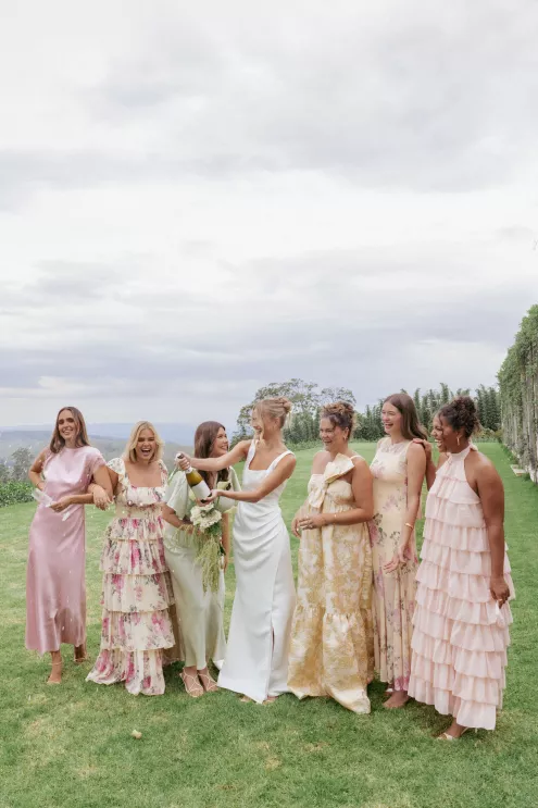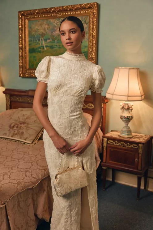 Another bridal party trend solidifying itself in the consciousness is bridesmaids in white, the modern twist on tradition that allows the entire bridal party to lean into a cohesive, editorial aesthetic. Lulus’ spring collection includes several ivory and cream gowns that could easily work for either a bride or bridesmaids, depending on the styling. Dresses like the Cadison Cream Textured Puff Sleeve Column Maxi Dress, Valeria White Lace Strapless Bustier Maxi Dress, and Eloise White Jacquard Pleated Maxi Dress and Scarf Set showcase minimalist silhouettes and textured fabrics that feel especially suited for fashion-forward celebrations.