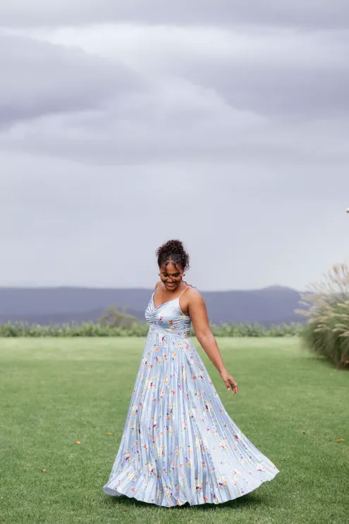 The collection carries that same approach into its bridesmaid offerings, introducing airy updates to chiffon, fluid pleating and fresh color stories. Soft blue, butter yellow and emerald green join floral prints that feel especially fitting for spring weddings and garden celebrations.