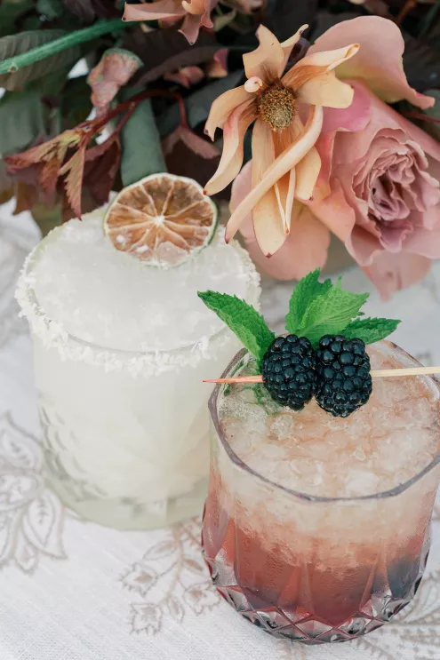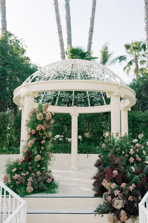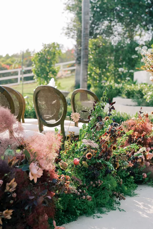 Designed by Flower Snob, the lush and unstructured floral arrangements are a mix of fresh blooms with dried textures, lending movement and visual interest.