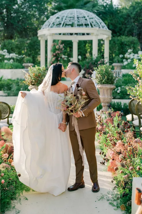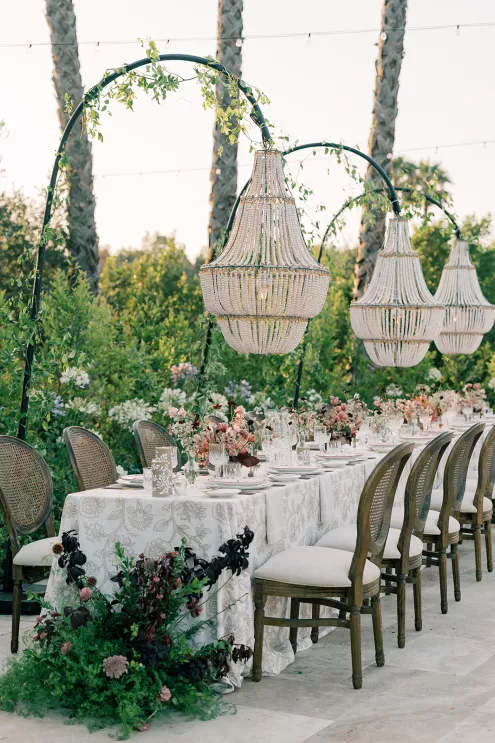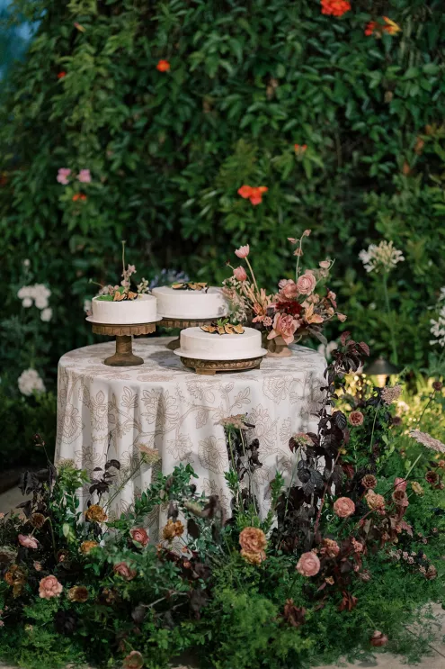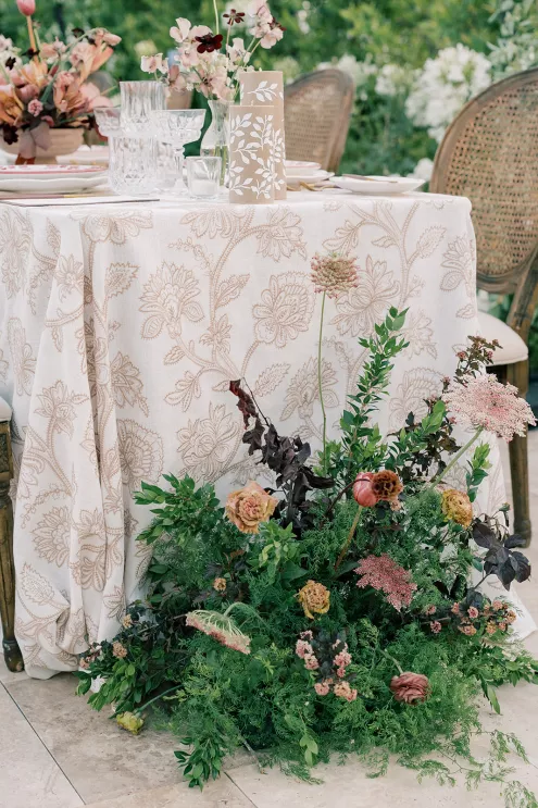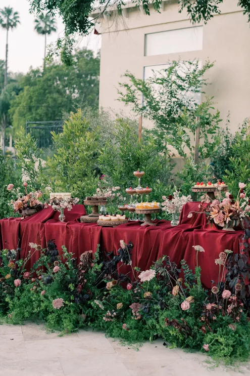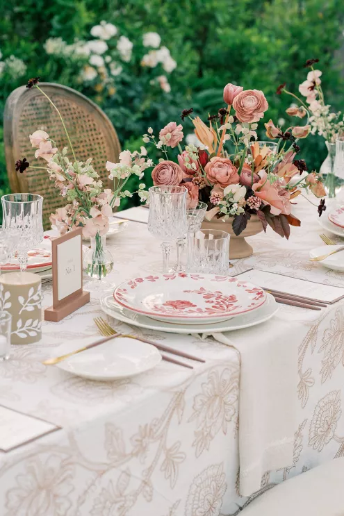 Shy away from dark colors in the summer? Never. Gaston was inspired by the overall palette of warm earth tones paired with rich burgundies and soft floral-forward accents. The goal, Gaston notes, was “to bring traditionally moody colors into a summer setting in a way that felt elevated, dimensional and effortlessly luxe.”