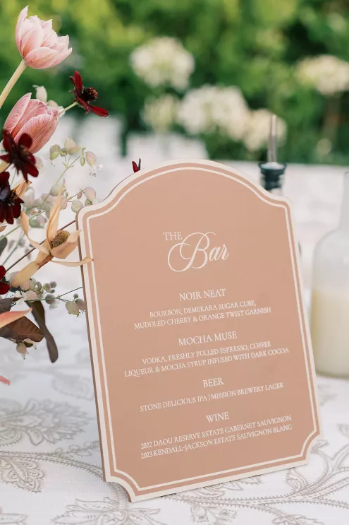 Floral-patterned clay dinner plates add an artisanal softness to the tablescape, while embroidered linens and richly hued, hand-painted floral candles round out the mocha palette in a way Gaston says is dimensional, never overpowering. “Every detail, from the layered textures to the refined color palette speaks to someone [who has] a deep appreciation for thoughtful aesthetics and curated experiences.”
