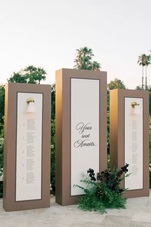 Guests are invited to find their dinner seat via a striking installation piece: a three-paneled seating chart featuring integrated lighting by Coull Concepts.