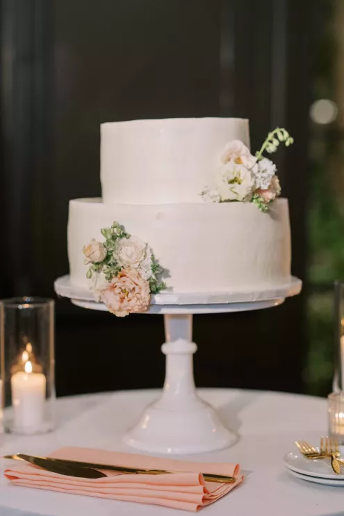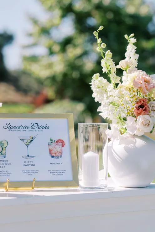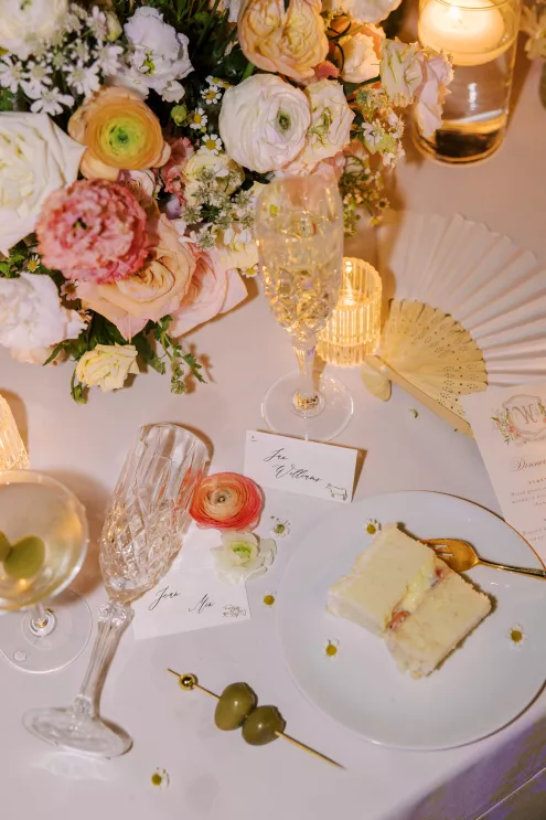 Cocktail hour unfolded just steps from the water, where guests sipped signature drinks and mingled to the sound of live piano and violin jazz. As the sun dropped below the horizon, dinner was served outdoors at round tables dressed with vintage-inspired settings of ivory plates, crystal goblets and gold flatware. Centerpieces overflowed with pastel blooms, echoing Jean's love of fresh flowers and creating an atmosphere that felt both intimate and abundant. Twilight deepened into night as candlelight bathed the reception in a warm glow, amplifying the sense of romance.