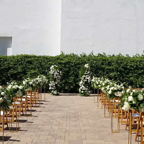 Step outside to the Plaza, an open-air courtyard that serves as a perfect complement to the indoor grandeur. Lush greenery, elegant architectural walls, and a romantic passionfruit vine create a backdrop that’s both soft and striking. Here, couples can host sunlit ceremonies, cocktail hours, or al fresco receptions. The transition from indoor to outdoor feels effortless, letting guests experience multiple dimensions of the venue without interruption. The Plaza captures the romance of an open sky while still offering the architectural drama that makes 440 Elm so unique.